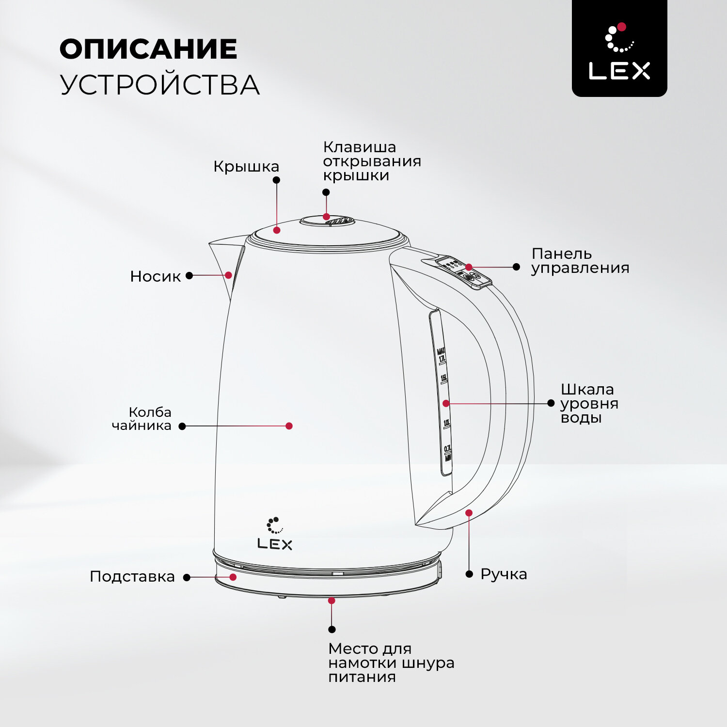 Купить Электрический чайник LEX LX 30021-2, материал кувшина - пищевая сталь SUS304, объем 1,7л, 4 режима нагрева и поддержания температуры воды, блокировка включения без воды, защита от перегрева.