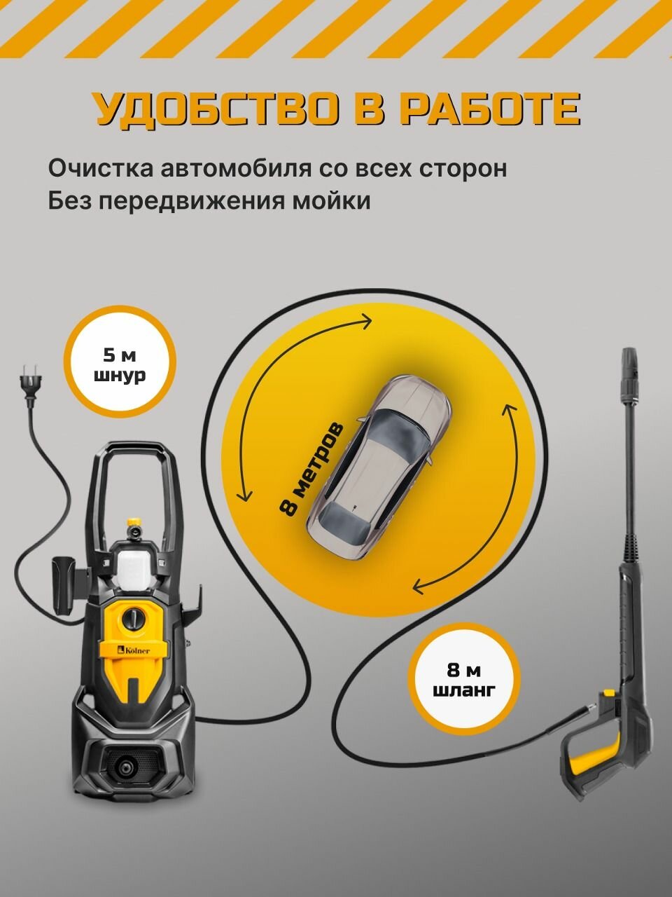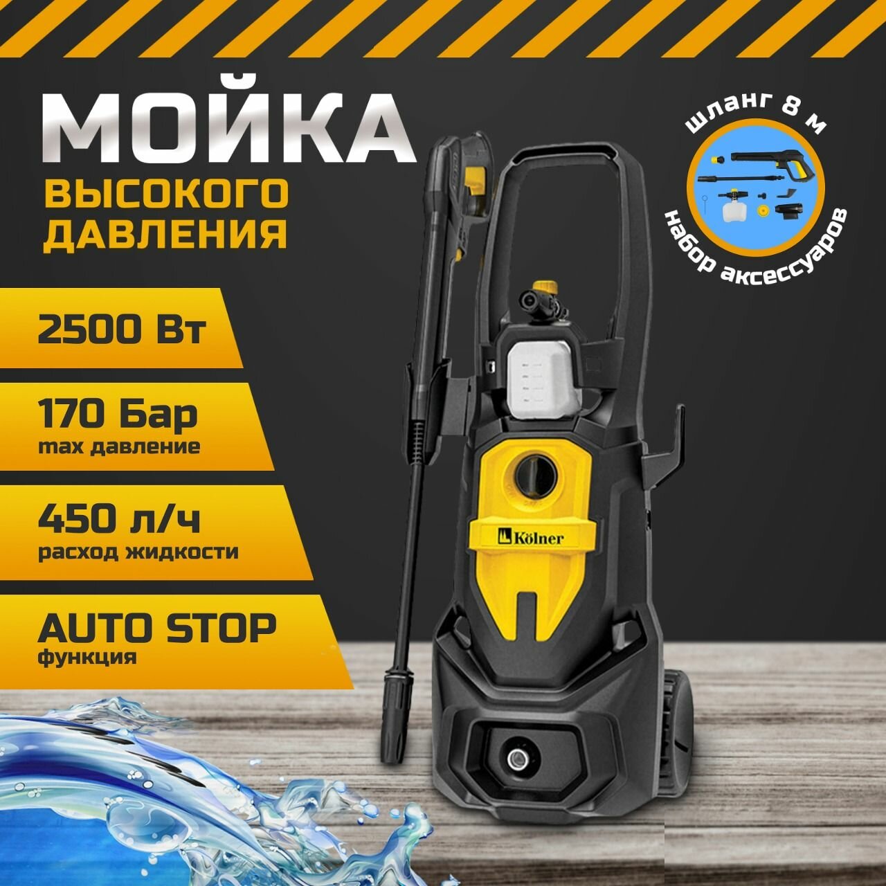 Мойка высокого давления Kolner K170 LUX для автомобиля, автомойка длина шланга 8 м, мощность 2500 Вт, электрическая 220 В, всасывание воды 450 л/ч, черный и желтый