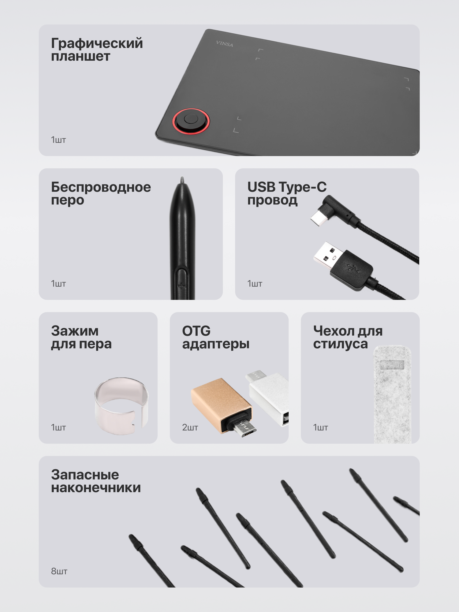 | Подробная комплектация | Цифровой графический планшет, стилус без батареи, сумка для ручек, USB-кабель, 2 OTG адаптера, 8 сменных наконечников |