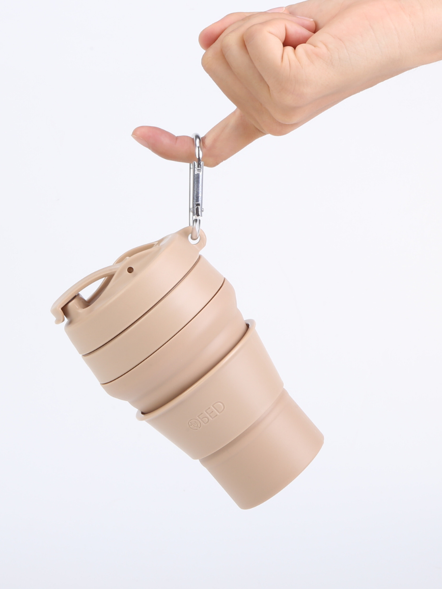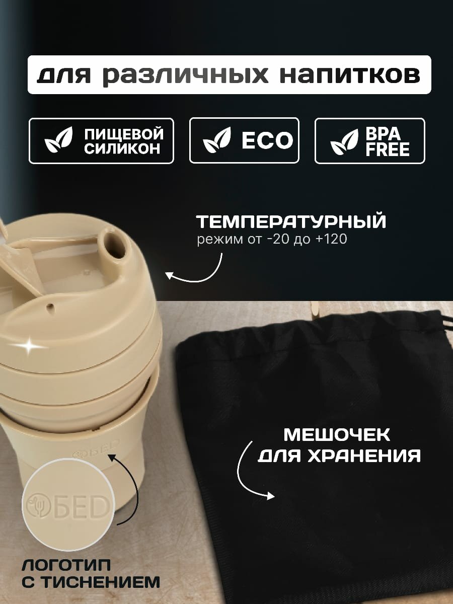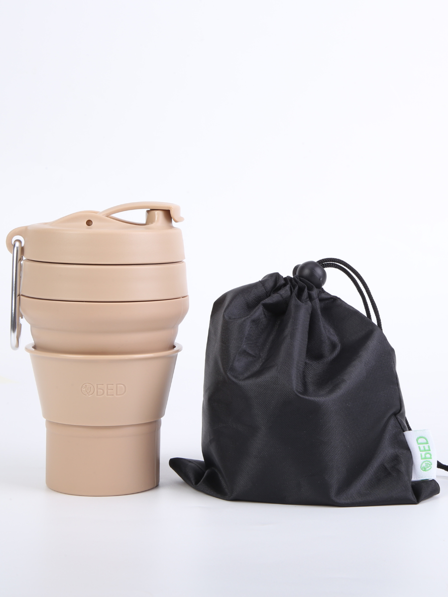 Стакан складной силиконовый c крышкой для кофе многоразовый для воды, чая, с мешочком для хранения, в машину, 350 мл,бежевый, обеd