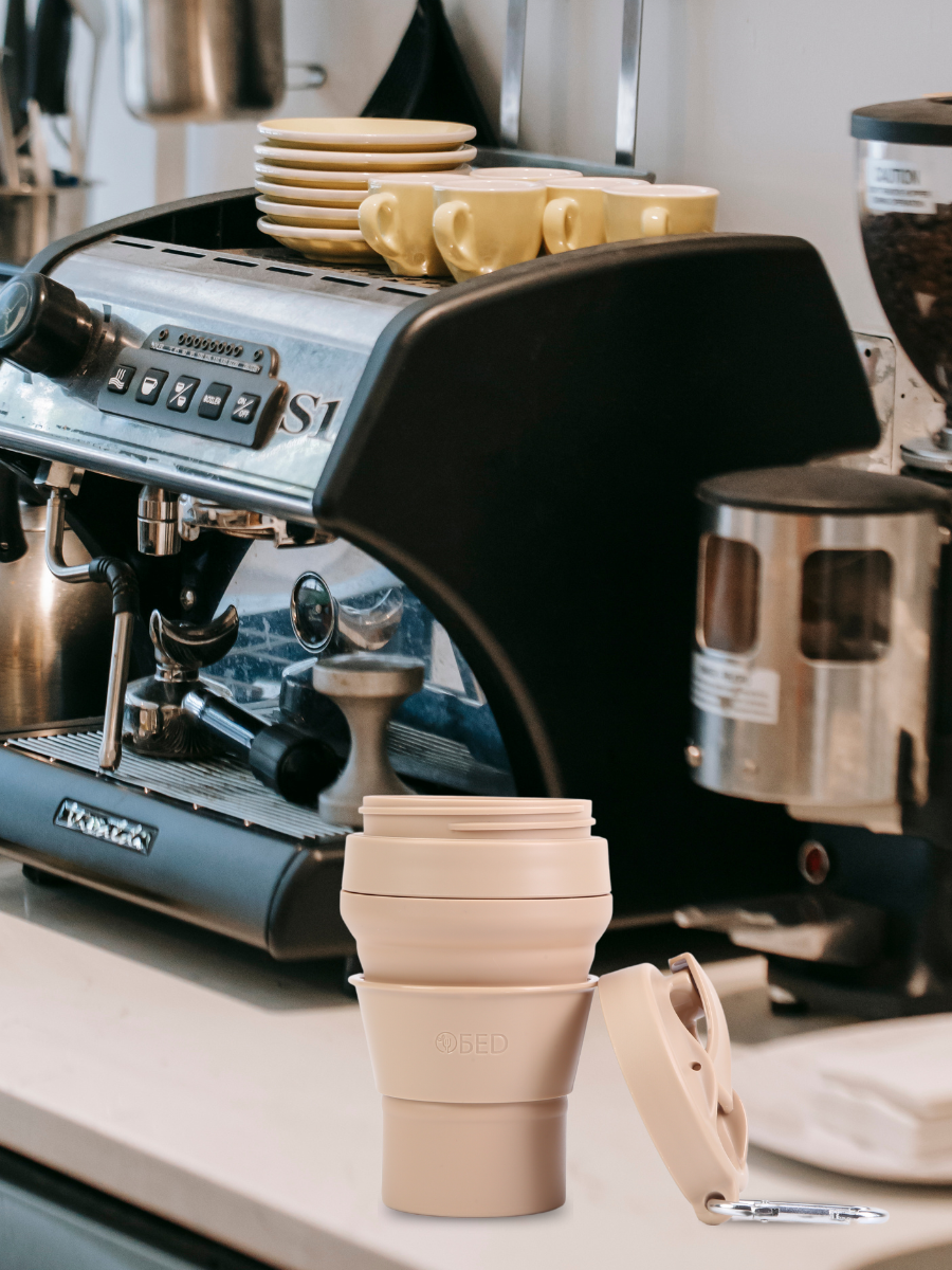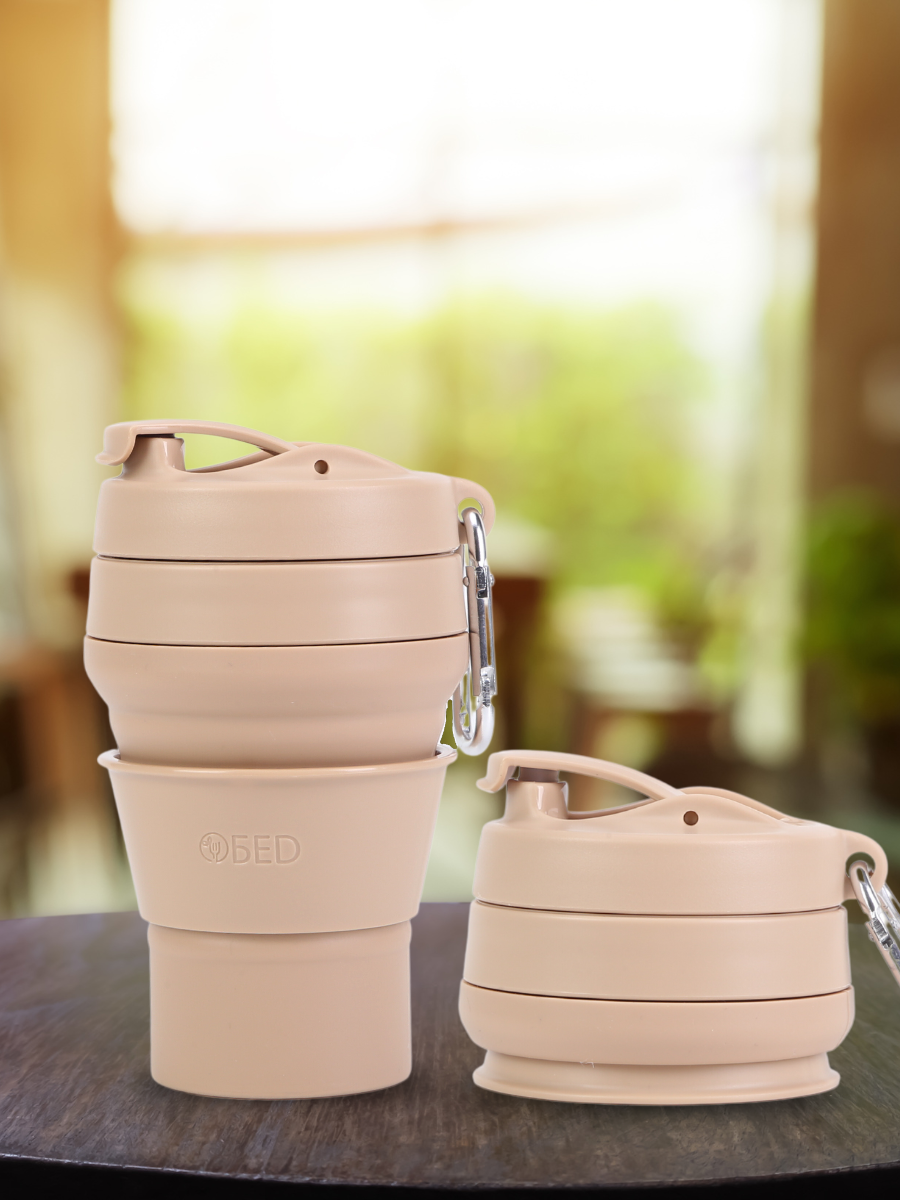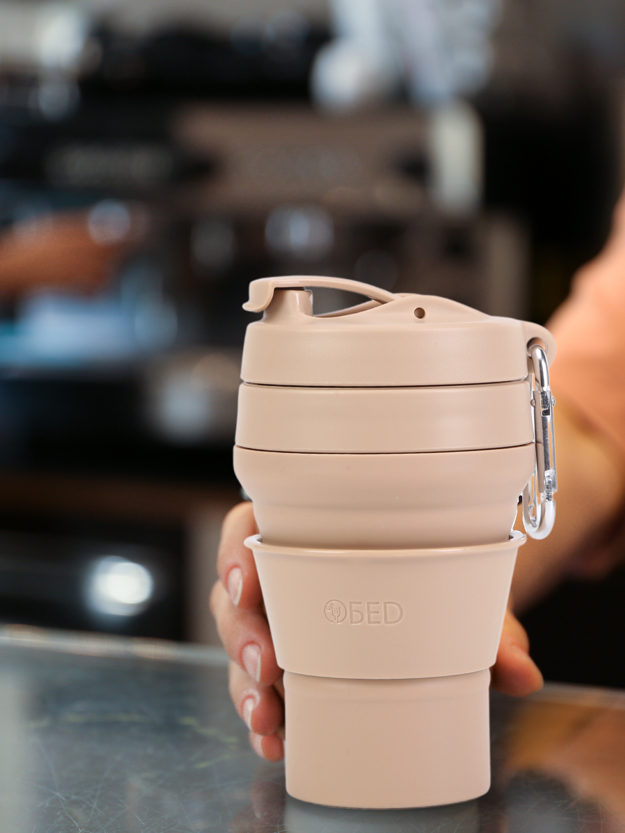 Стакан складной силиконовый c крышкой для кофе многоразовый для воды, чая, с мешочком для хранения, в машину, 350 мл,бежевый, обеd