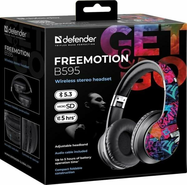 Наушники беспроводные Defender FreeMotion B595 черный+граффити, Bluetooth .