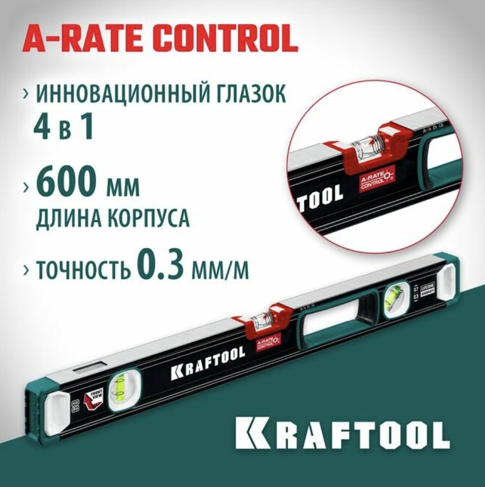 KRAFTOOL A-RATE CONTROL, 600 мм, точность 0.3 мм/м, с зеркальным глазком, сверхпрочный магнитный уровень (34988-60)
