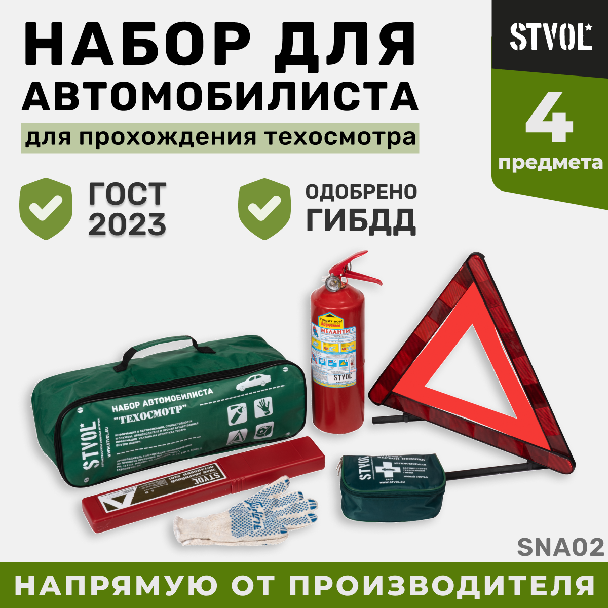 STVOL SNA02 Набор автомобилиста Техосмотр ГОСТ (Знак+Аптечка+Огнетушитель ОП2+Перчатки) STVOL шт