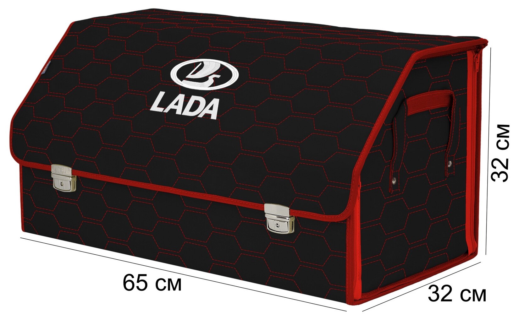 Органайзер-саквояж в багажник "Союз Премиум" (размер L). Цвет: черный с красной прострочкой Соты и вышивкой LADA (лада).