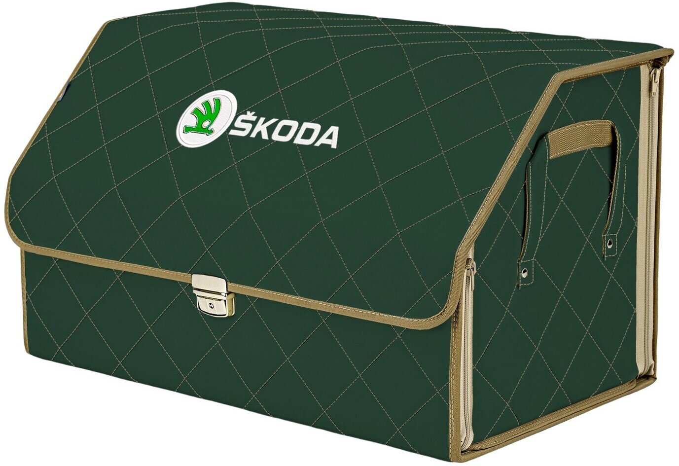 Органайзер-саквояж в багажник "Союз Премиум" (размер L). Цвет: зеленый с бежевой прострочкой Ромб и вышивкой Skoda (Шкода).