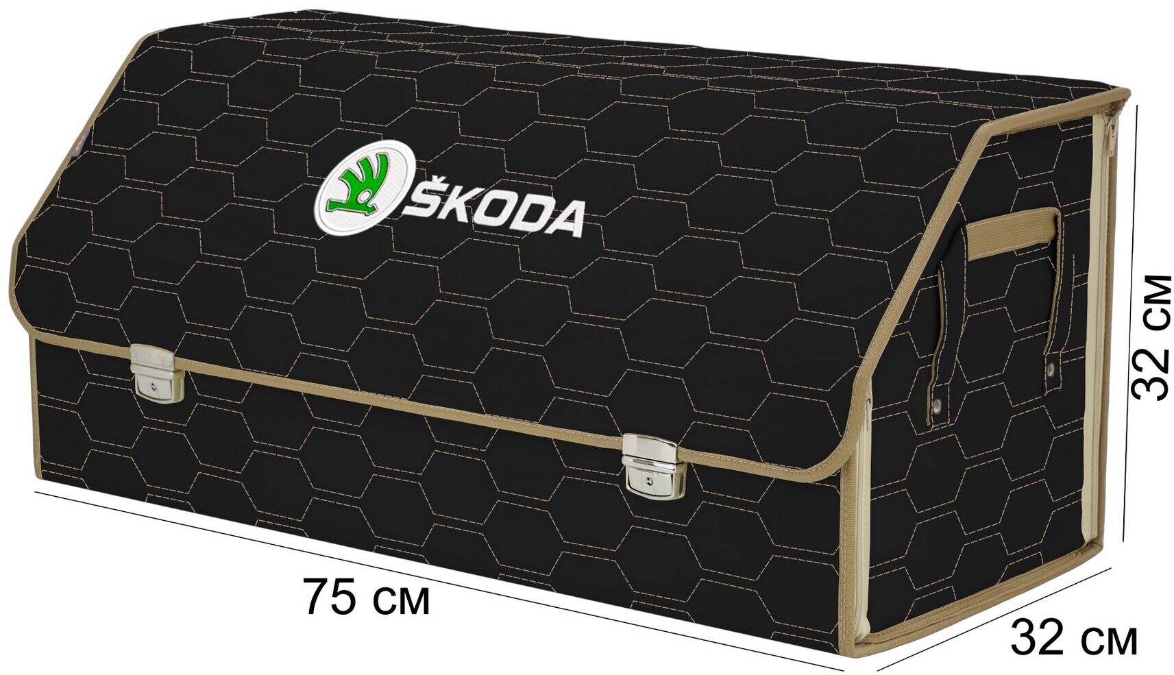 Органайзер-саквояж в багажник "Союз Премиум" (размер XXL). Цвет: черный с бежевой прострочкой Соты и вышивкой Skoda (Шкода).