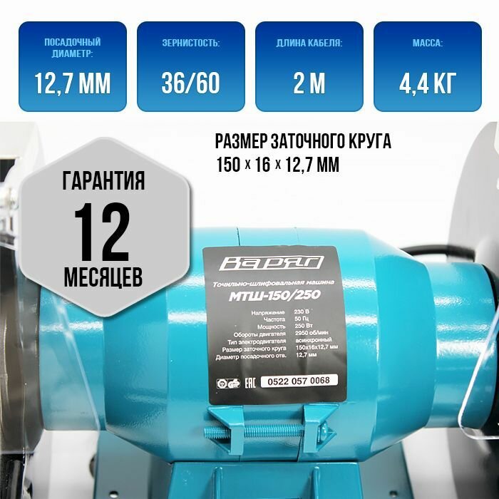 Точильно-шлифовальная машина варяг МТШ-150/250 (250Вт,2950об/мин,150х16х12,7мм) / Электроточило