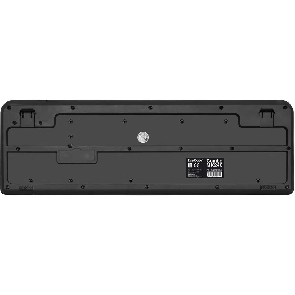 Комплект беспроводной ExeGate Professional Standard Combo MK240 (клавиатура полноразмерная влагозащищенная 115кл. + мышь оптическая 800/1000/1200dpi, 4 кнопки и колесо прокрутки, USB, радиоканал 2,4 ГГц, радиус действия до 12м, черный, Color Box) EX286220