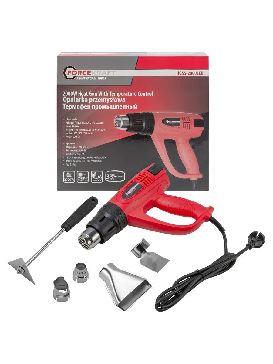 Фен промышленный электрический с насадками (220В,50/60Гц,2000Вт, 60/350/600C, 50/300/500л/мин,3 режима,класс защиты-двойная изоляция) FORCEKRAFT FK-HG55-2000LED