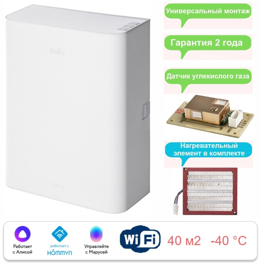Приточный очиститель воздуха Ballu OneAir ASP-100 белый + нагревательный элемент+ датчик СО2