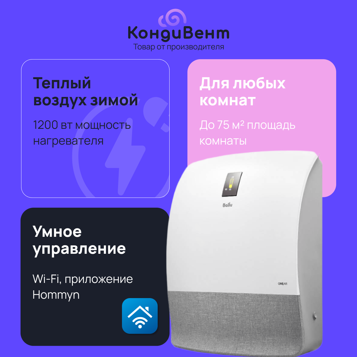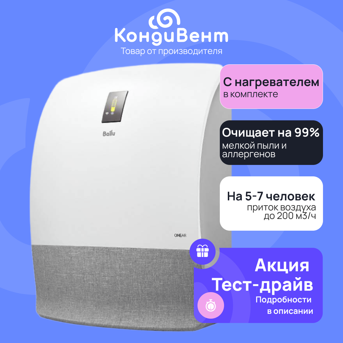 Очиститель воздуха приточный Ballu ONEAIR ASP-200S с серой вставкой + нагревательный элемент интересное: