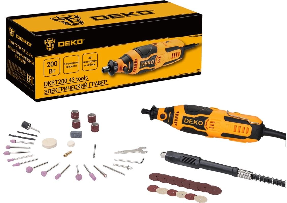 Гравер электрический Deko DKRT200 с регулировкой скорости, 200 Вт + набор аксессуаров 43 шт .
