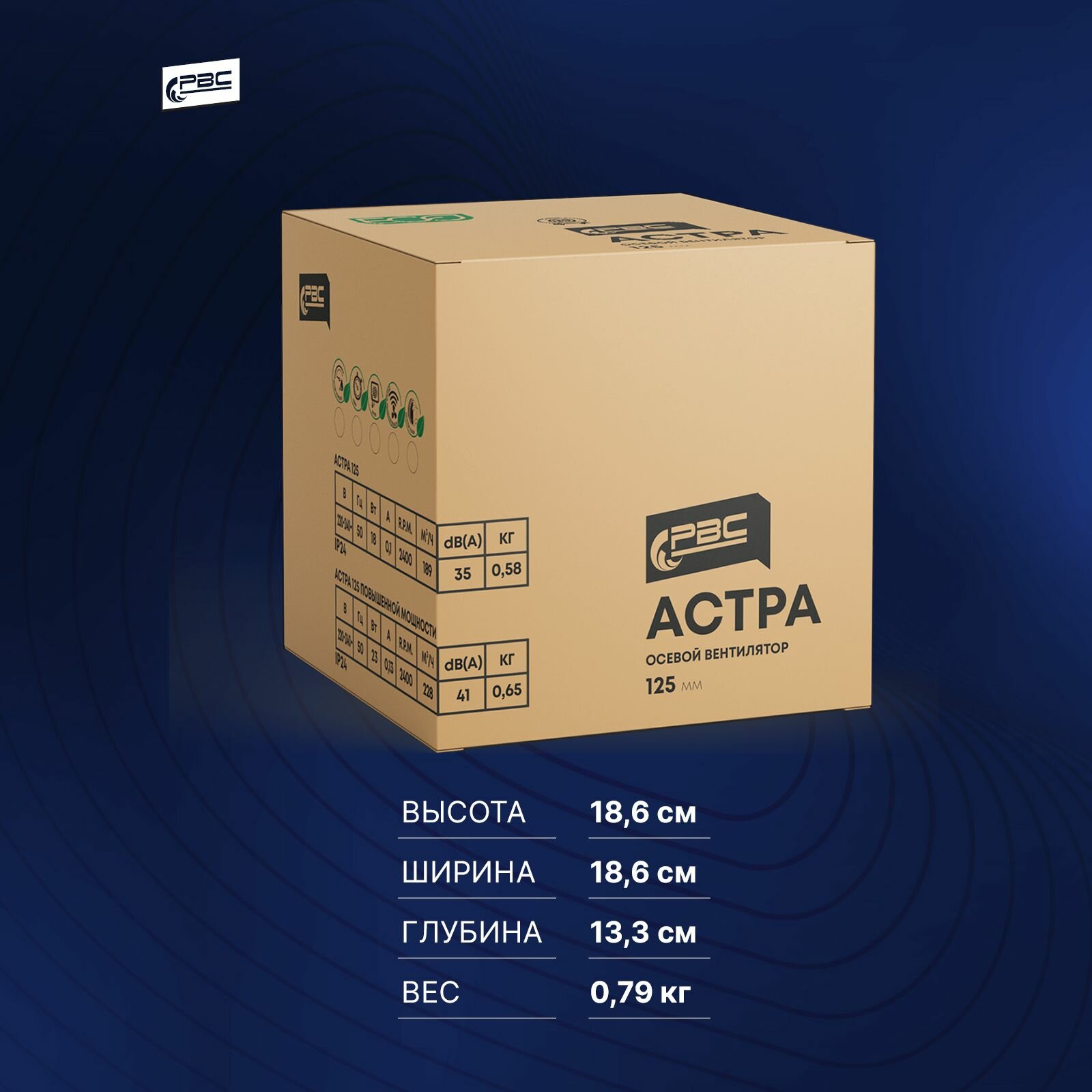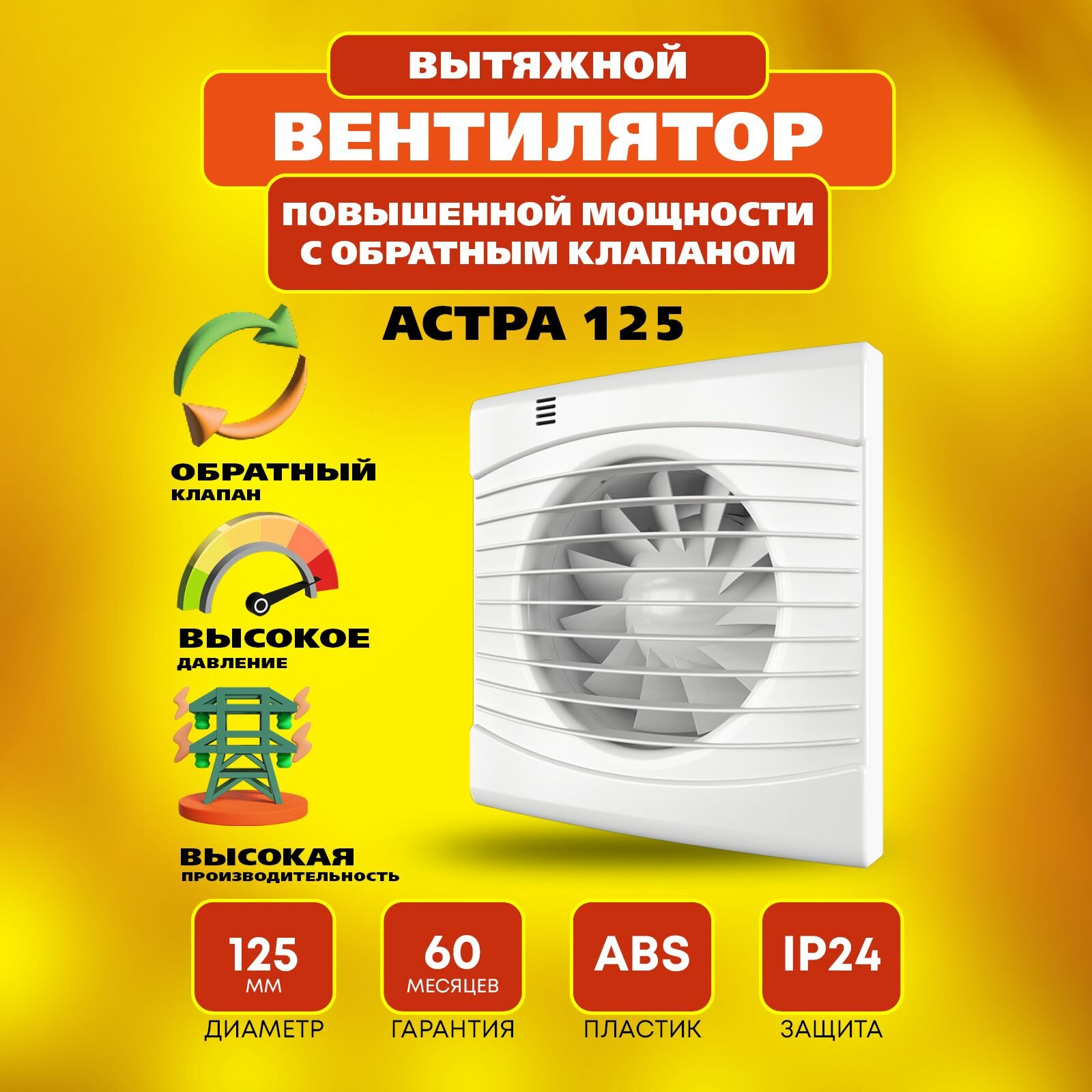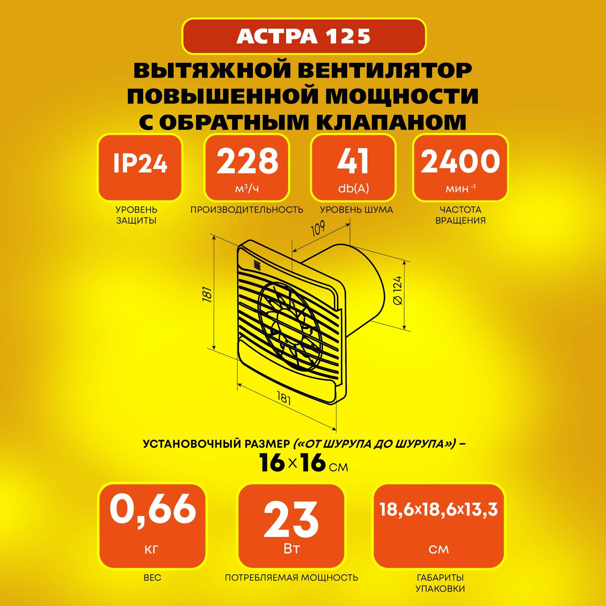 Вентилятор вытяжной Рвс Астра 125 повышенной мощности, 23 Вт, 41 дБ, 228 м3/ч, обратный клапан