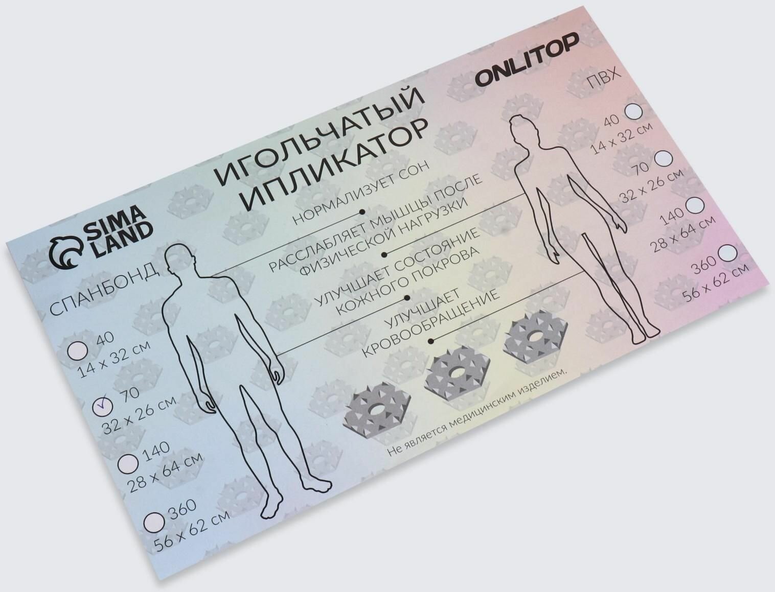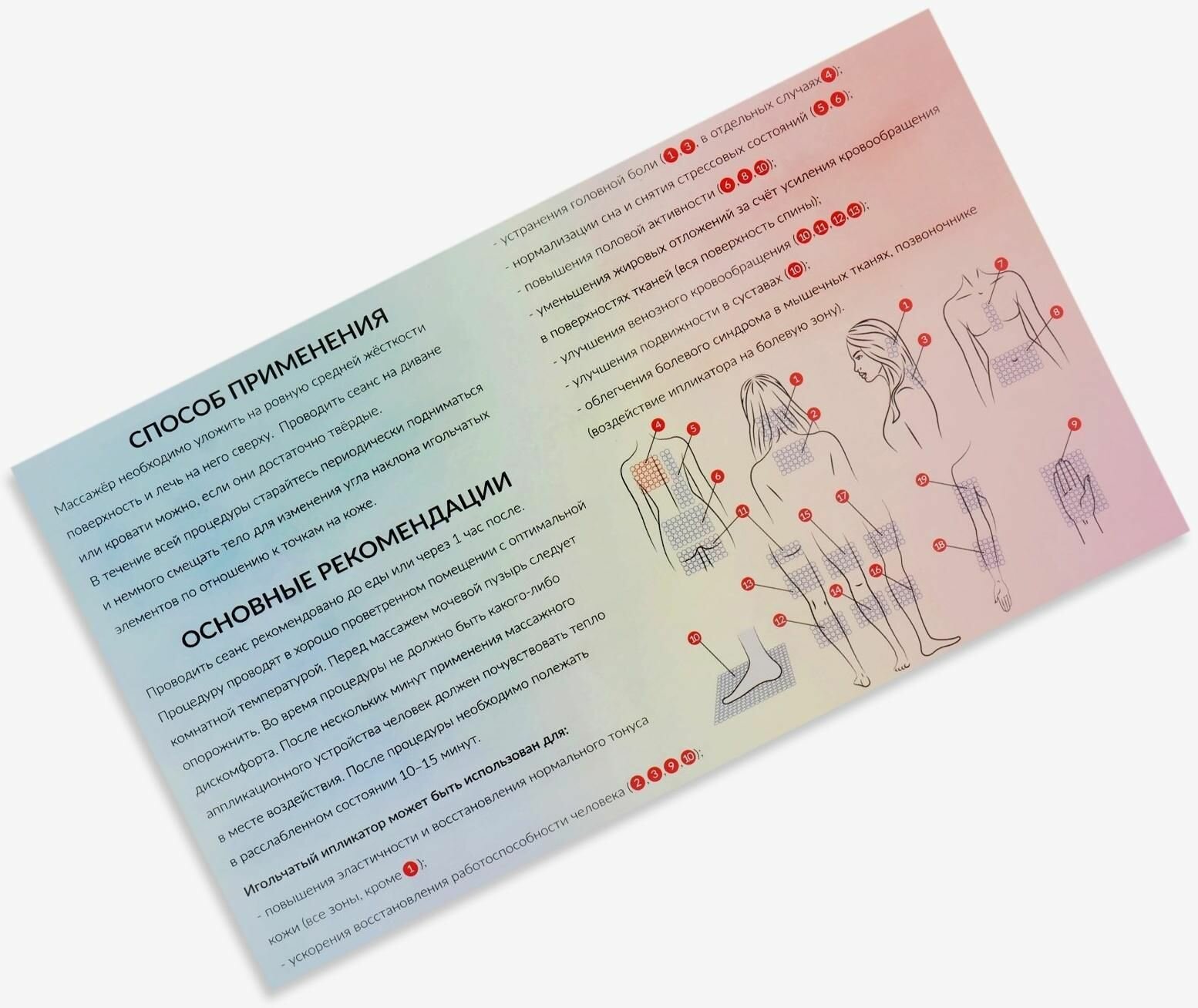 | Дополнительная информация | Коврик для массажа; Ипликатор; Точечный массаж; Массаж для тела; Массаж для спины; Российское производство; Улучшение кровообращения; Релаксация и массаж; Массаж для суставов; Повышение эластичности кожи; Массаж для шеи; Борьба со стрессом |