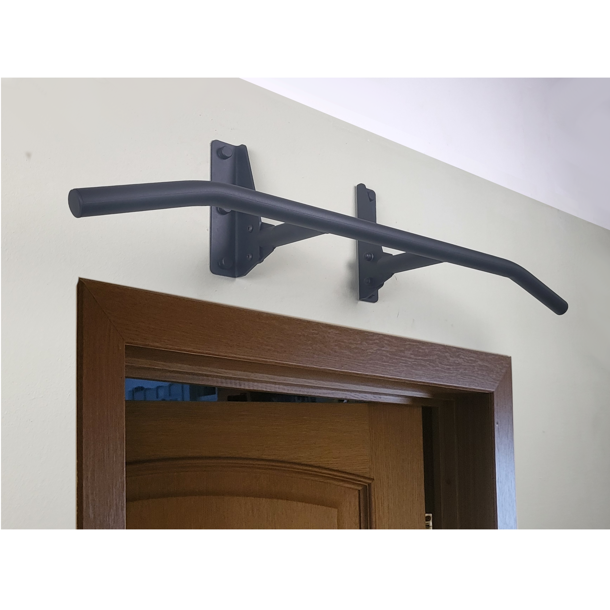 Турник наддверный IronWall PRO модель D1 4-00 с чёрной перекладиной с нескользящим покрытием "муар" и черными кронштейнами крепления к стене