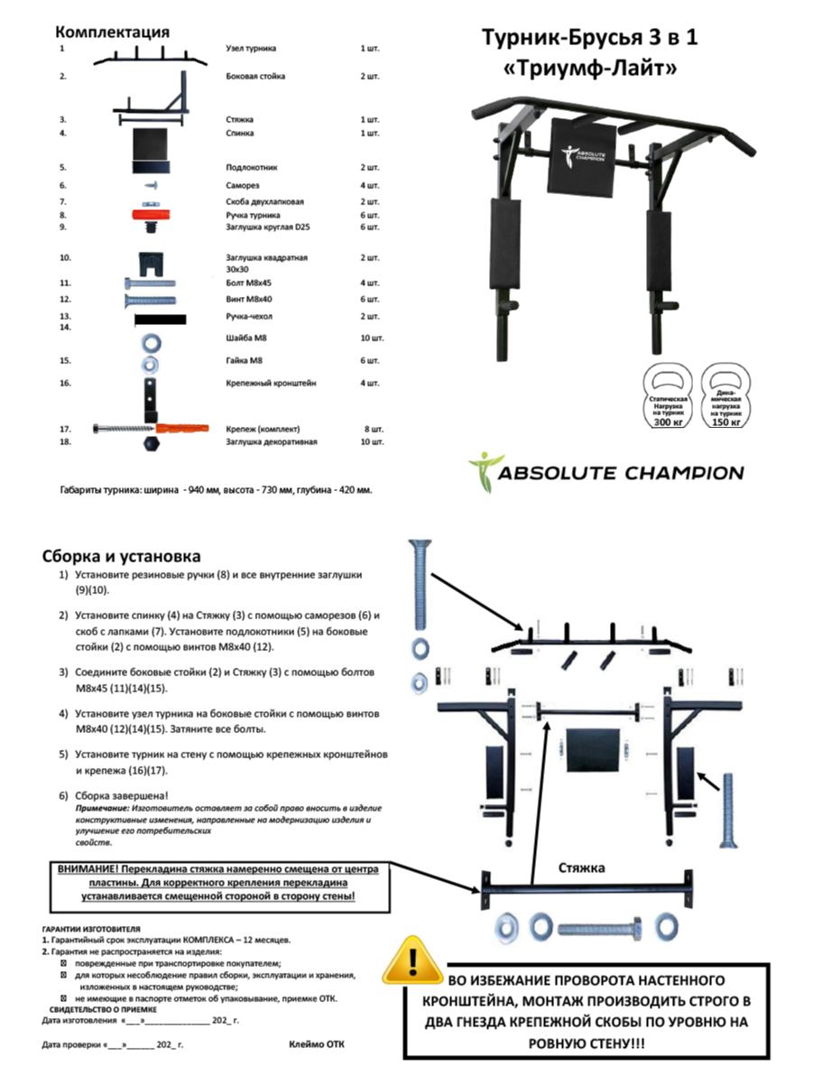 | Тип | 3в1: турник / брусья / пресс |