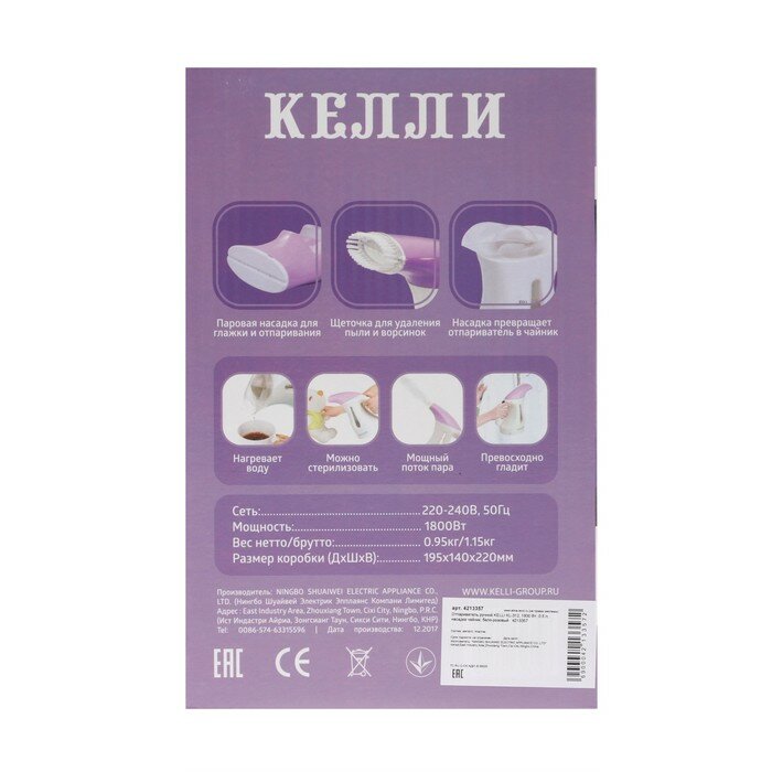 Kelli Отпариватель KELLI KL-312, ручной, 2000 Вт, 500 мл, насадка чайник, бело-розовый интересное:
