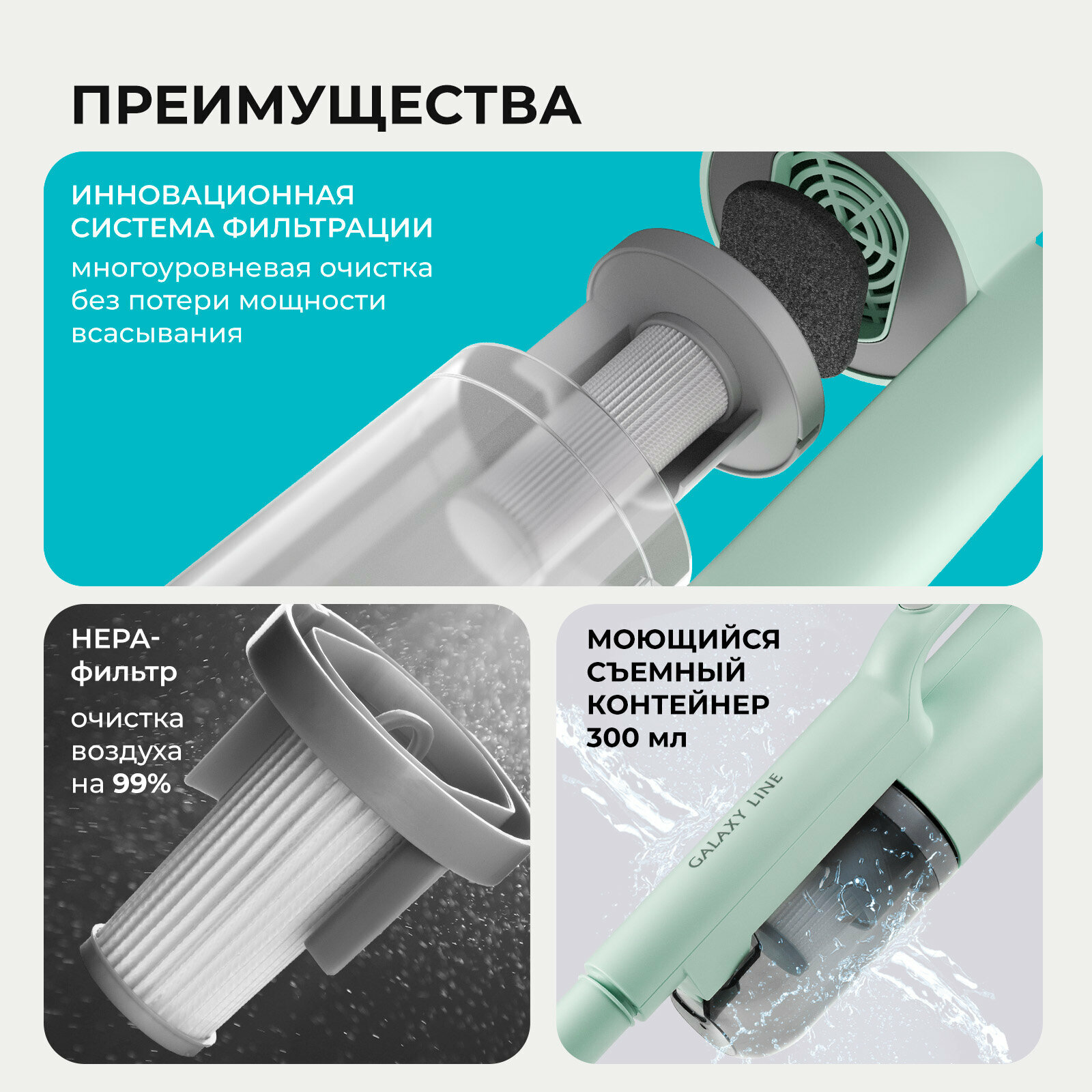 Пылесос аккумуляторный Galaxy LINE GL 6221, мятный