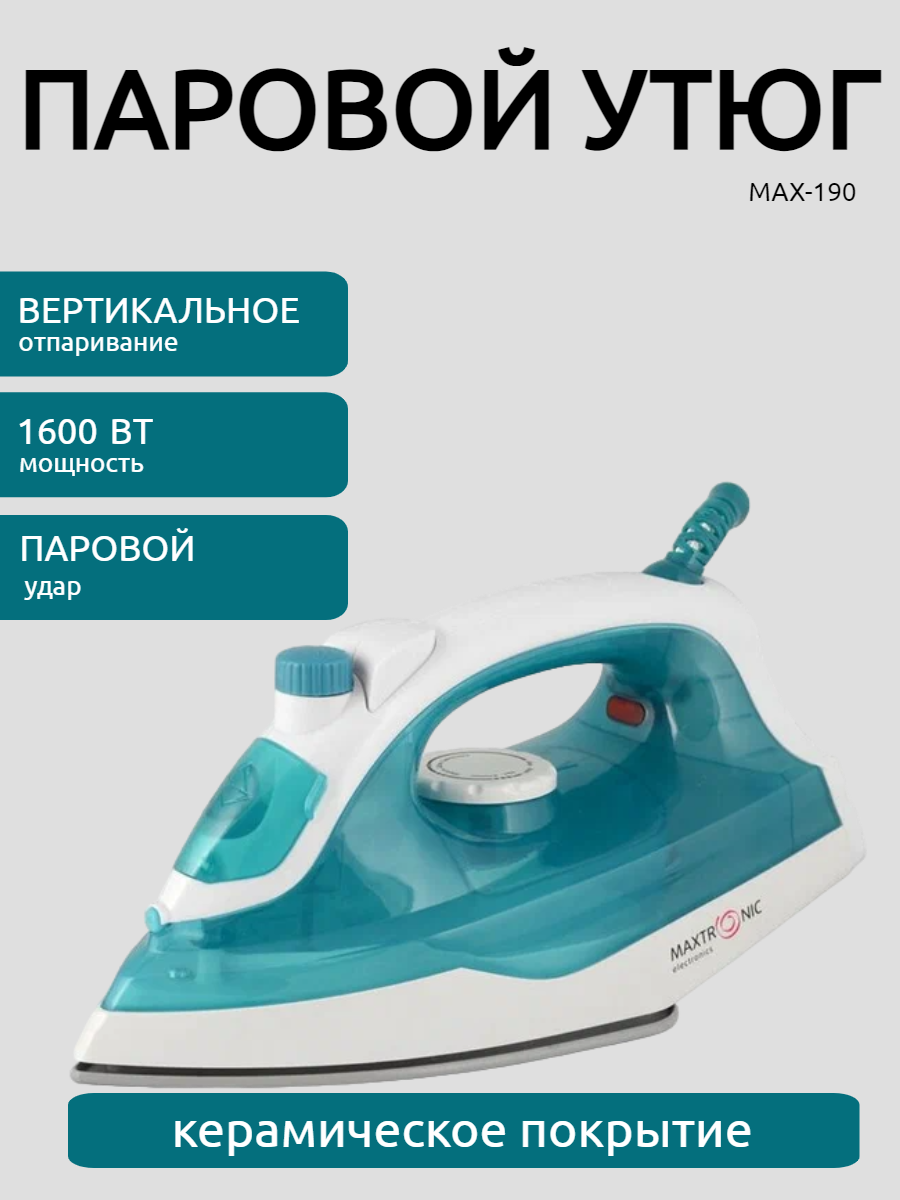 Утюг для одежды с отпаривателем для дома MAXTRONIC MAX-190, 1600 Вт, паровой удар, постоянный пар, керамика