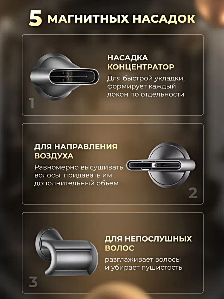 | Насадки | диффузор / для выпрямления / для непослушных волос / концентратор / направленный поток |