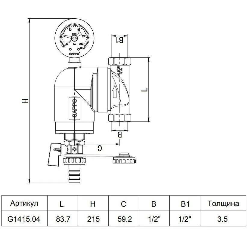 Фильтр промывной свободного вращения Gappo G1415.04 с манометром и дренажным краном 1/2", ВР-ВР