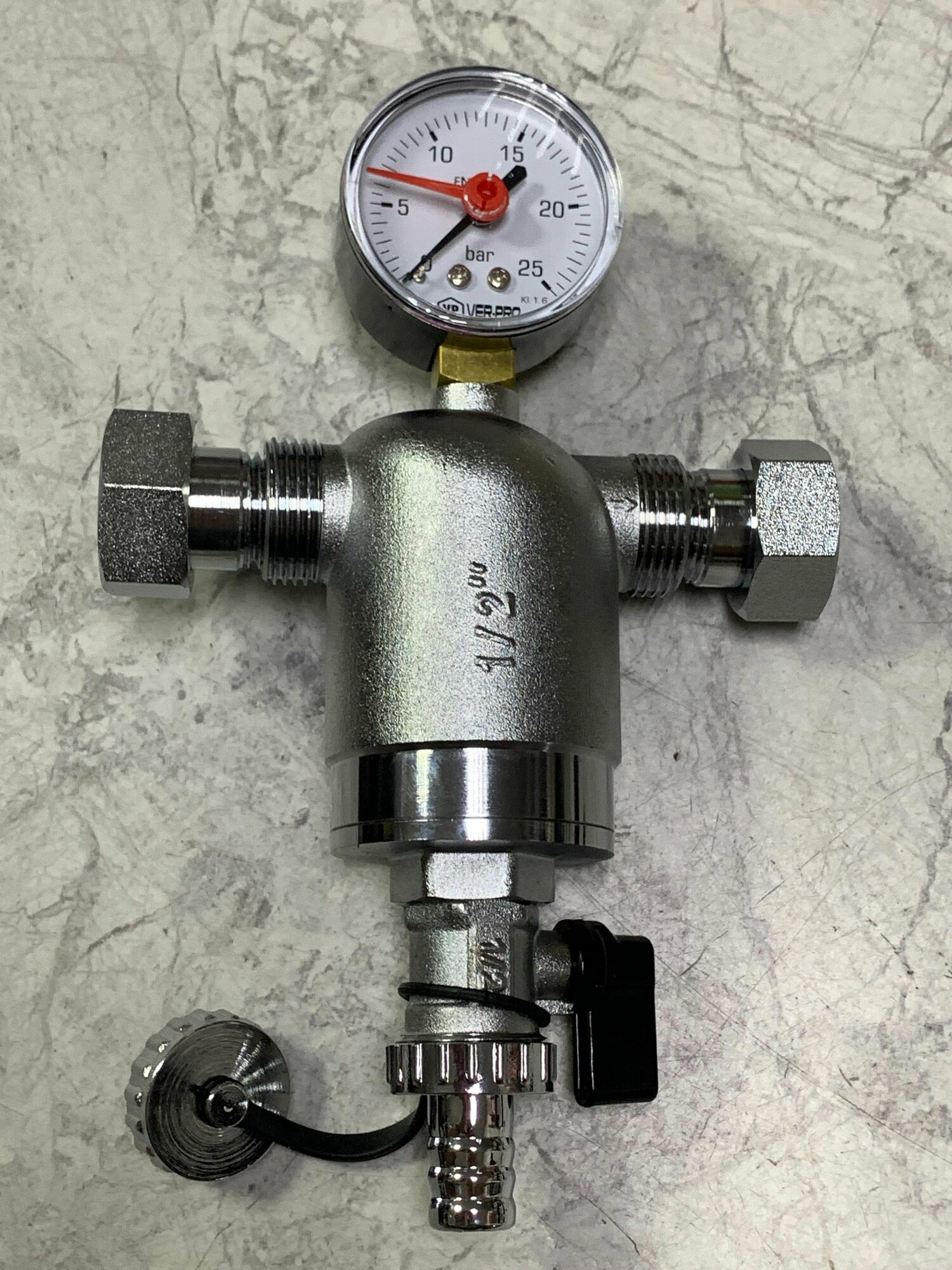 Самопромывной фильтр с регулятором давления и манометром 1/2" для горячей воды, никелированный ViEiR