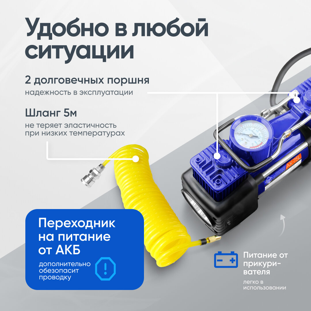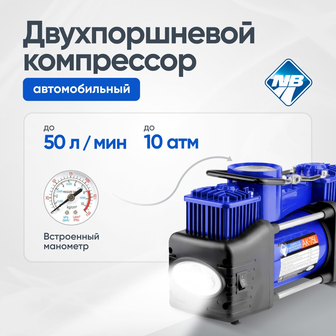 Nova Bright Компрессор АК-75L двухпоршневой, до 50 л/мин., 150 PSI, 12В, металлический корпус, в сумке, LED-фонарь 36451