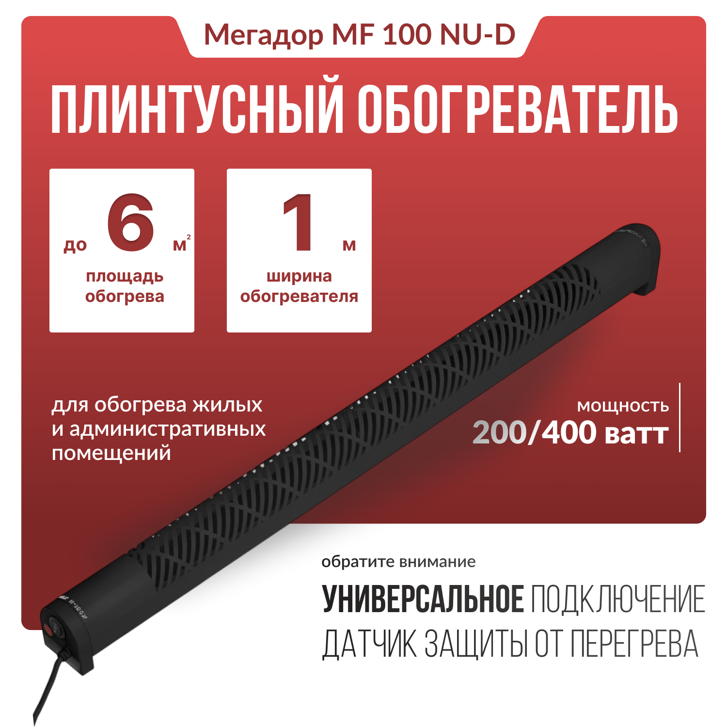 Обогреватель плинтусный универсальный Мегадор MF100NU Черный, универсальное подключение