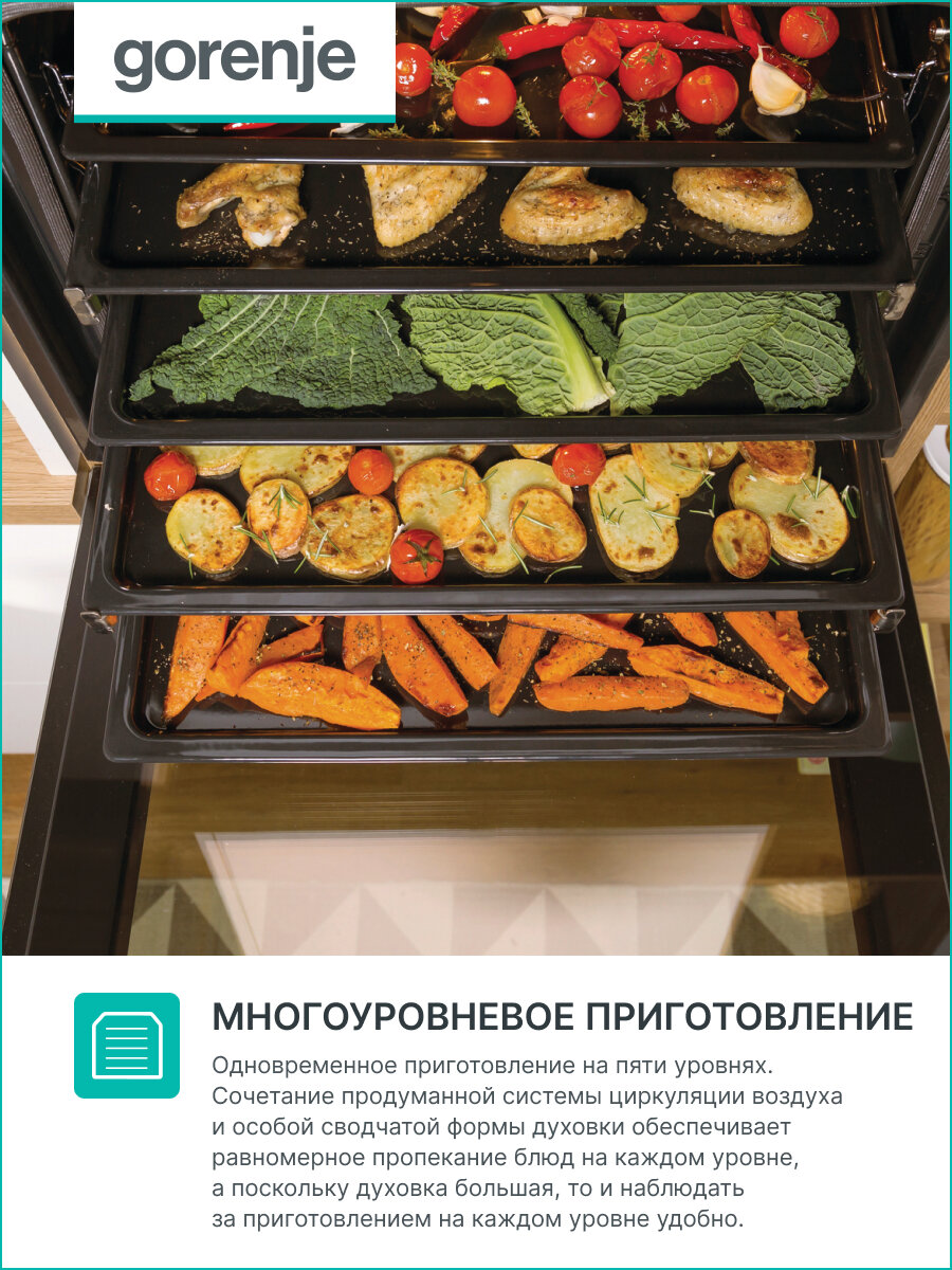 СохранитьЭлектрический духовой шкаф Gorenje BO6737E03AWG встраиваемый, многоуровневый, сенсорный программатор, белый интересное: