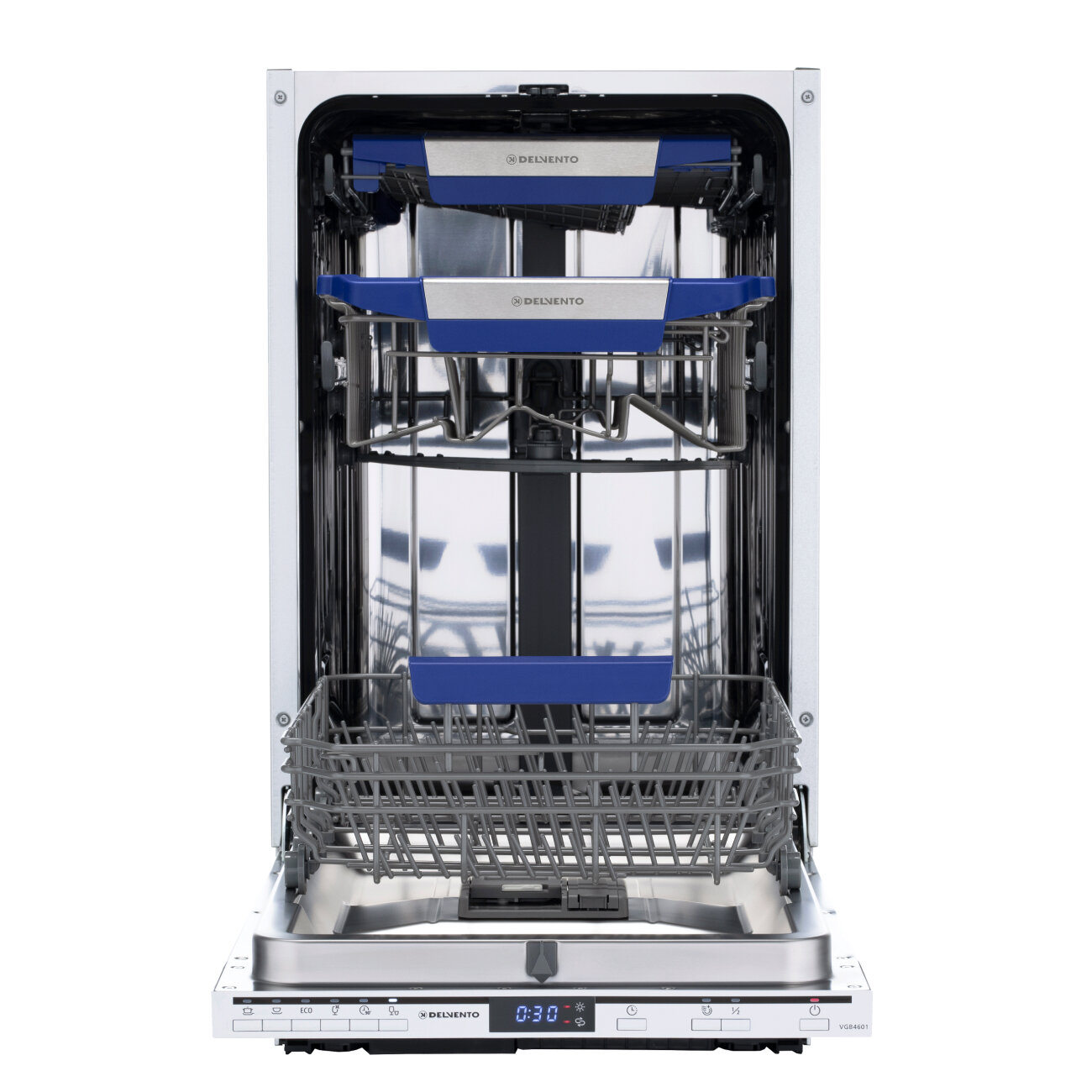 Посудомоечная машина встраиваемая 45 см DELVENTO VGB4601 / 6 программ / 10 комплектов посуды / защита от протечек / Класс A++ / Active сушка / Половинная загрузка / 3 ящика загрузки / Отдельный ящик для столовых приборов / LED дисплей / индикация времени