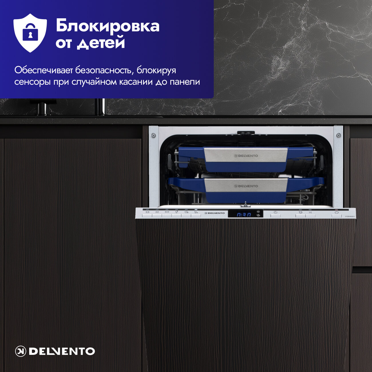 Посудомоечная машина 45 см встраиваемая узкая DELVENTO VGB4600 / 6 программ / 10 комплектов / белый / цифровой дисплей / 2 корзины загрузки / отложенный старт / блокировка от детей / защита от протечек / гарантия 3 года