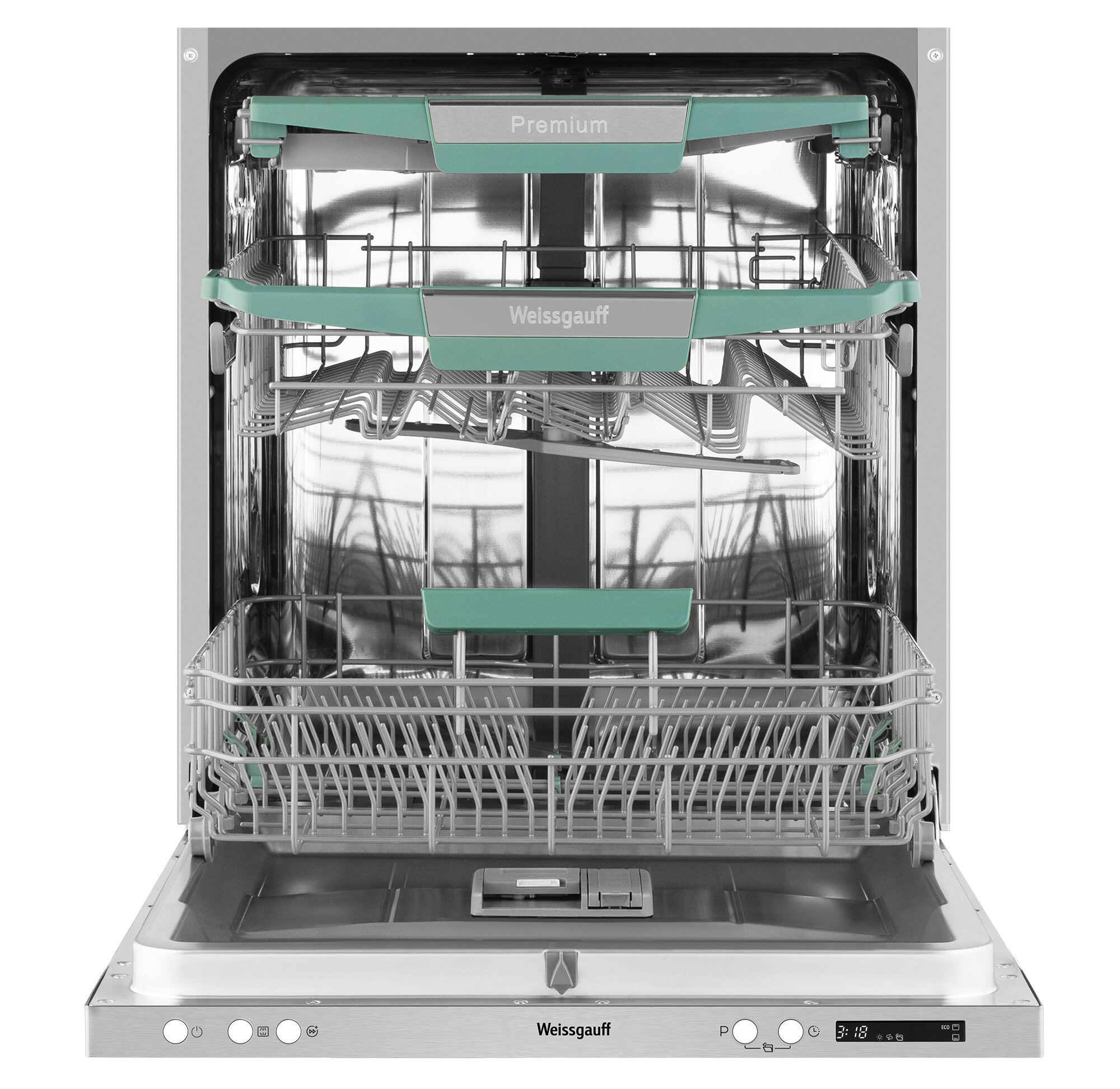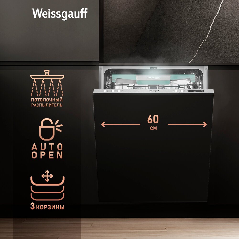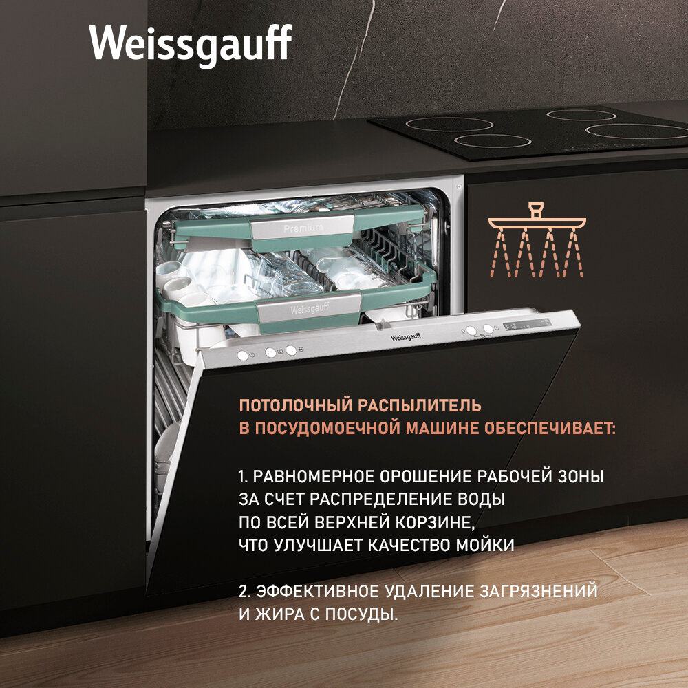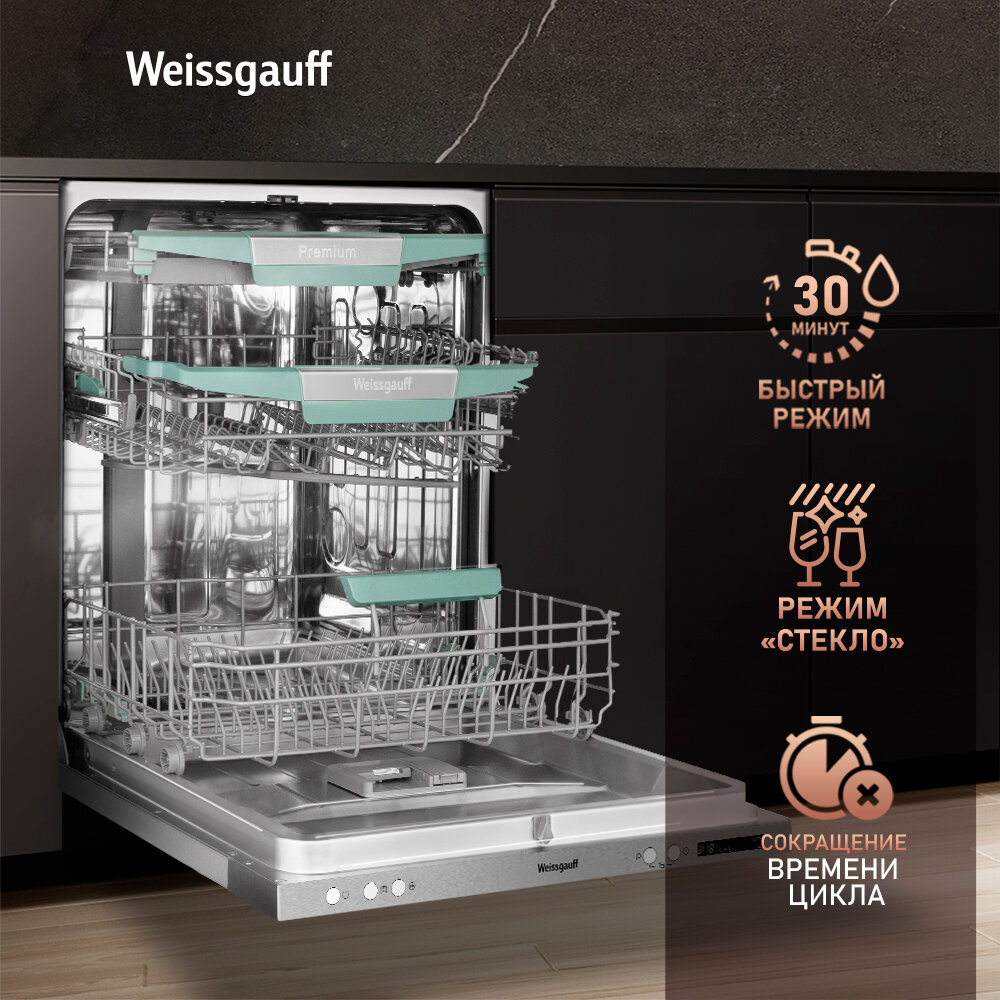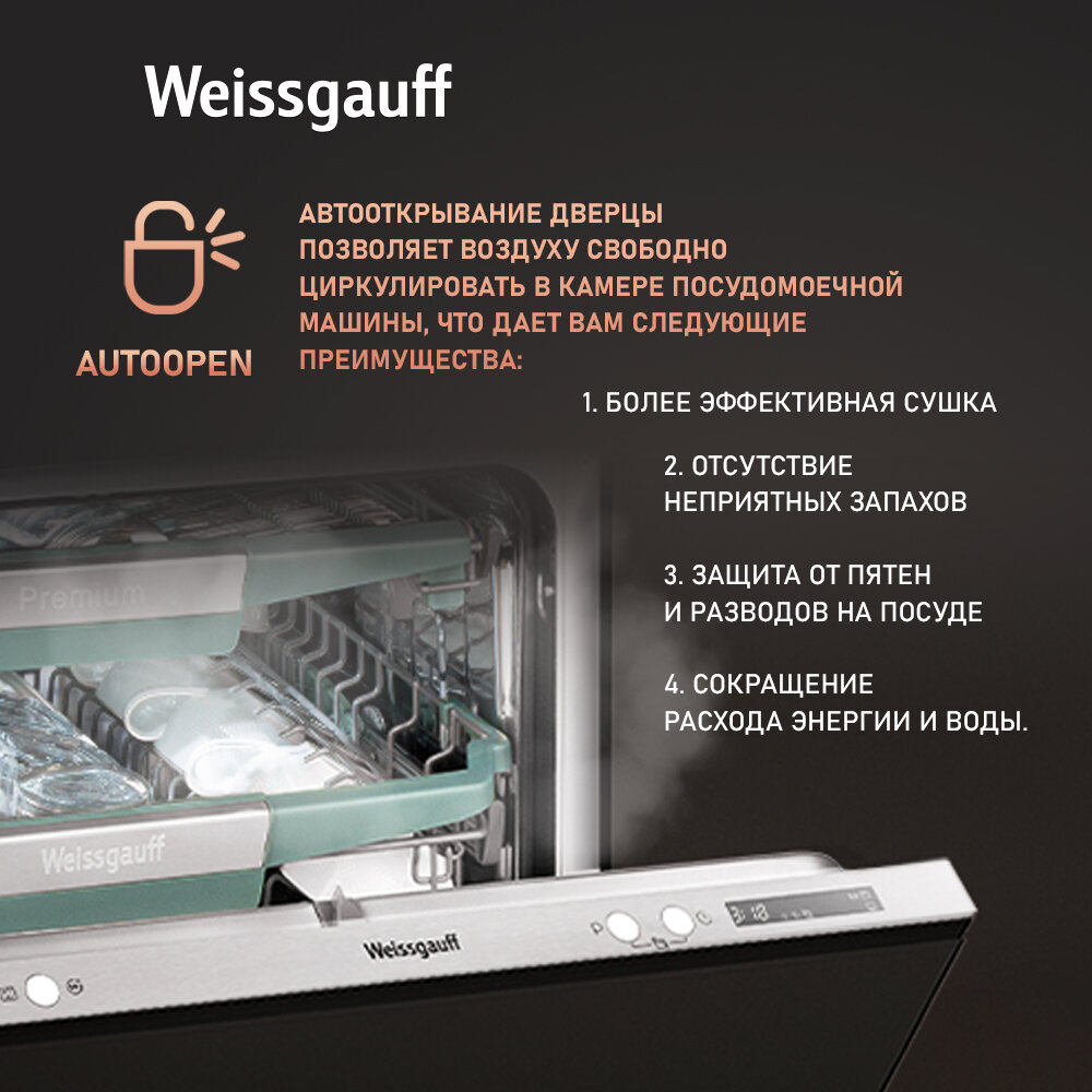Встраиваемая посудомоечная машина с проекцией времени на полу, авто-открыванием и инвертором Weissgauff BDW 6075 D Inverter AutoOpen Timer Floor,3 года гарантии, 3 корзины, 14 комплектов посуды, 8 программ, дозагрузка посуды, таймер