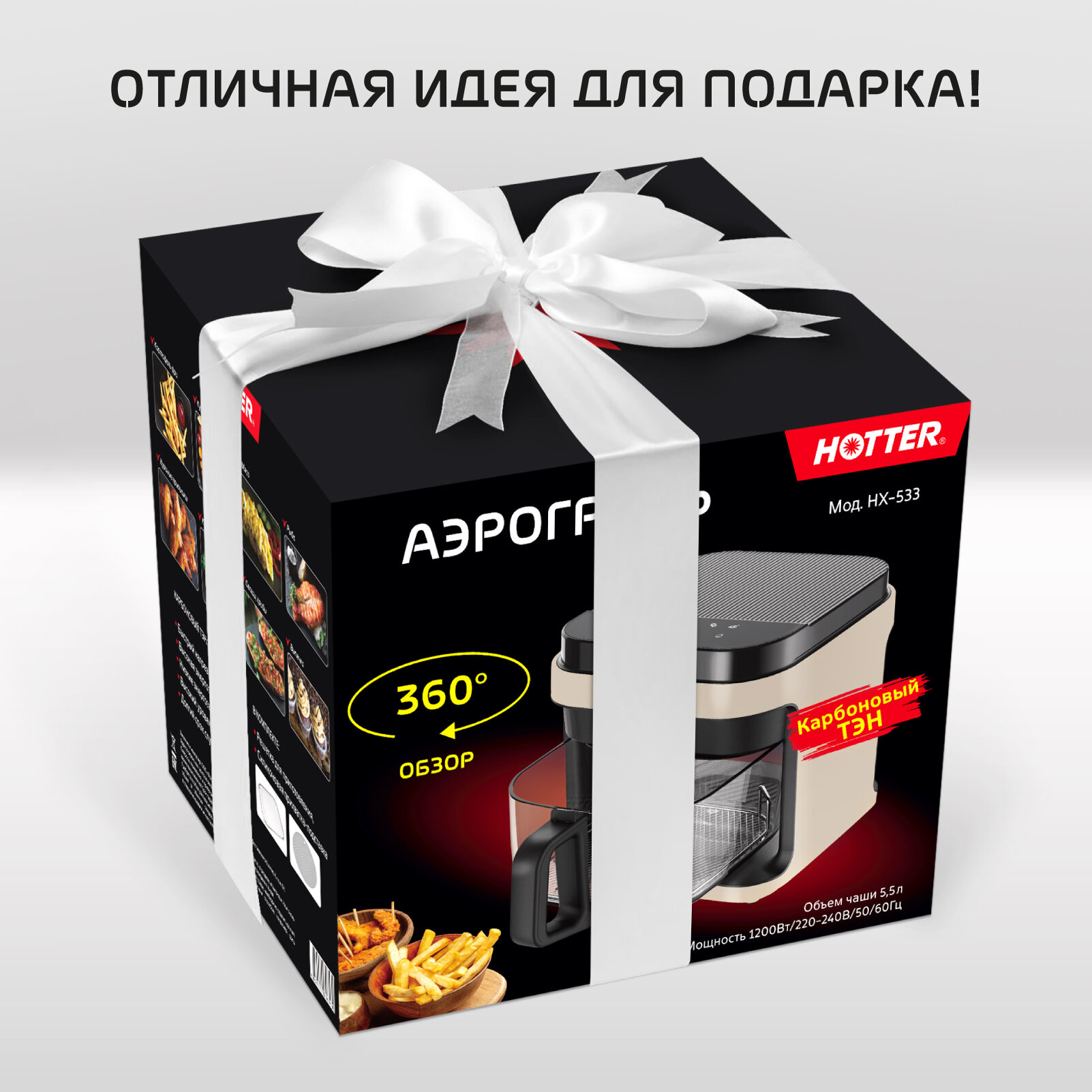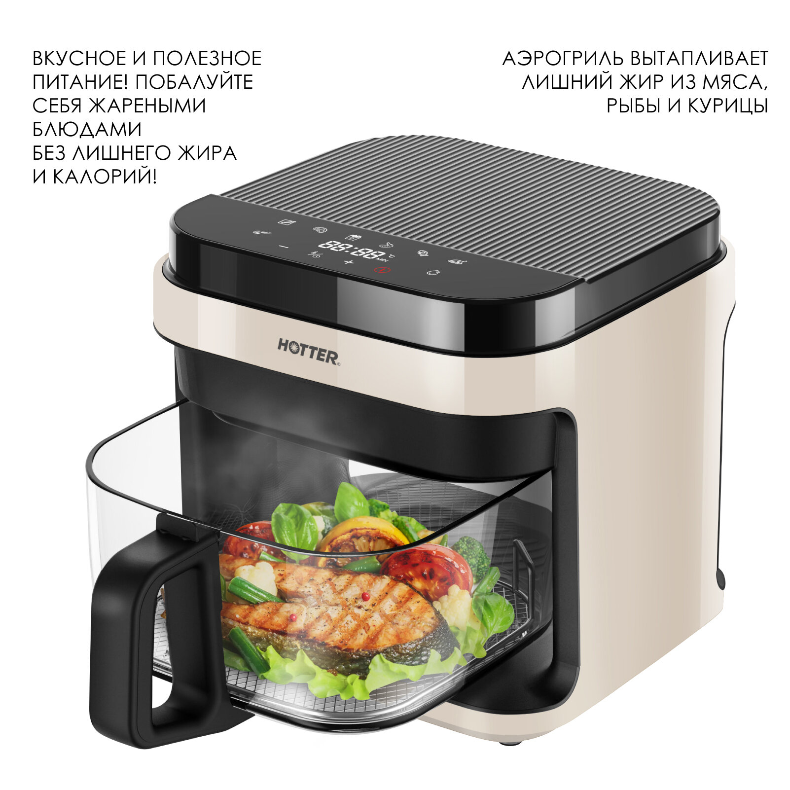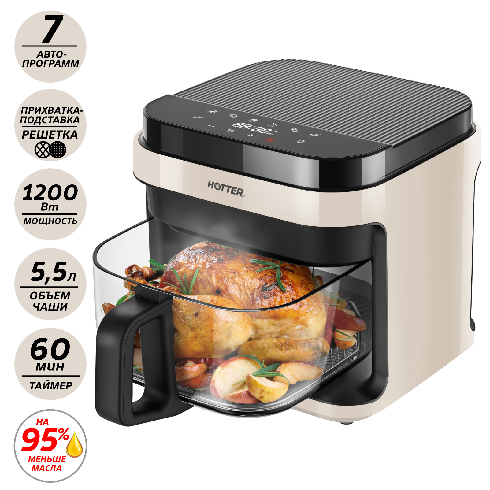 Аэрогриль Hotter HX-533 бежевый/черный, объем стеклянной чаши 5,5 литров, 7 автопрограмм и регулировка времени и температуры