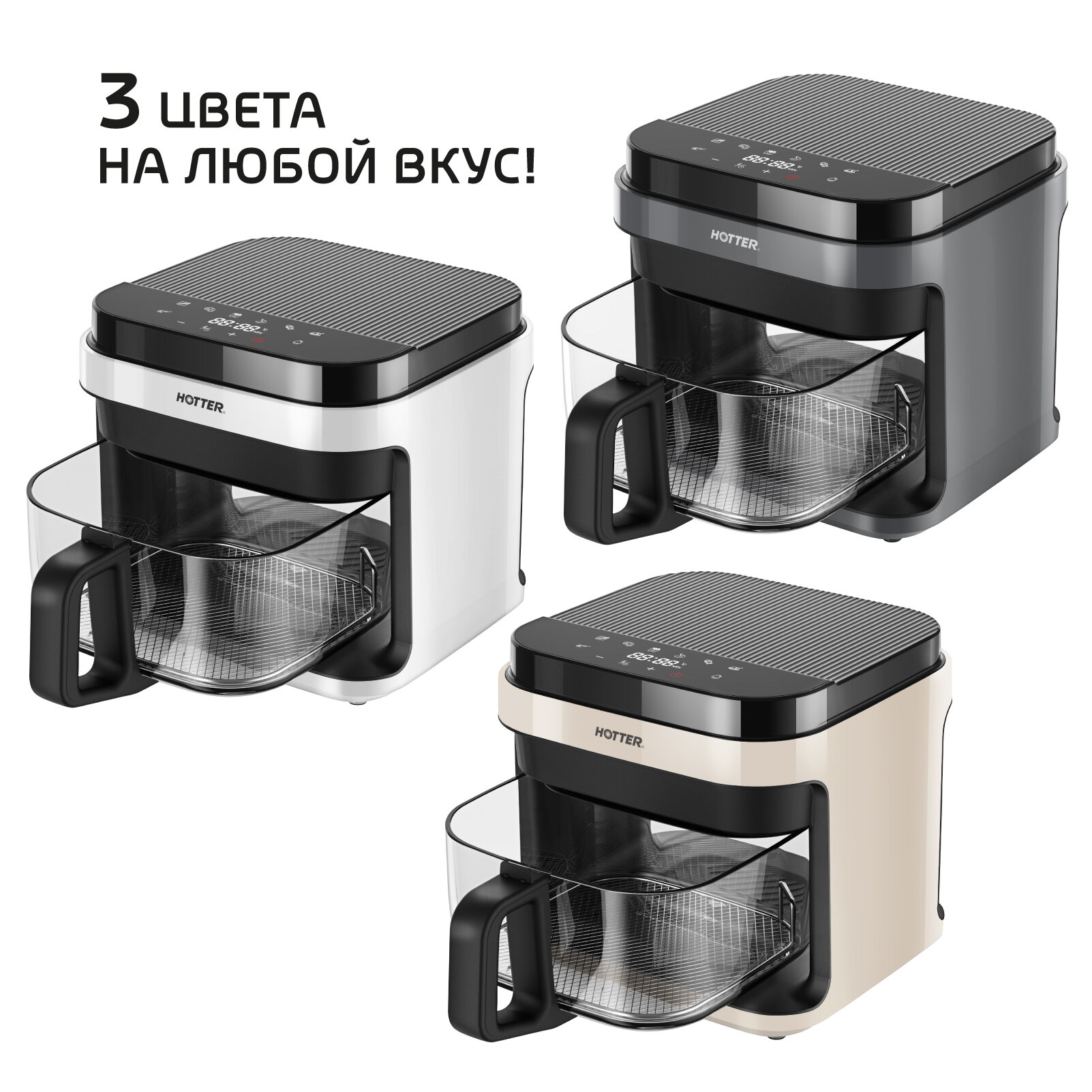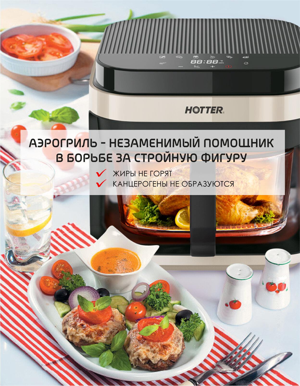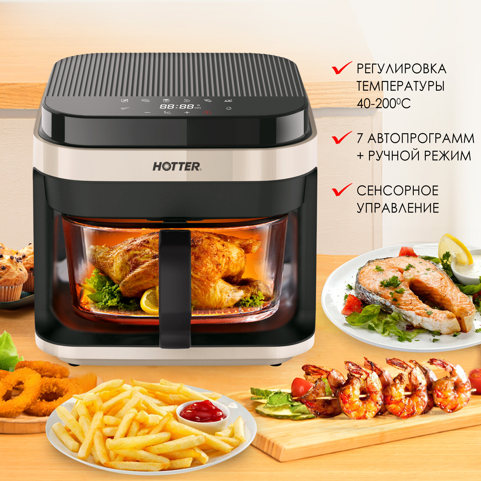 Аэрогриль Hotter HX-533 бежевый/черный, объем стеклянной чаши 5,5 литров, 7 автопрограмм и регулировка времени и температуры