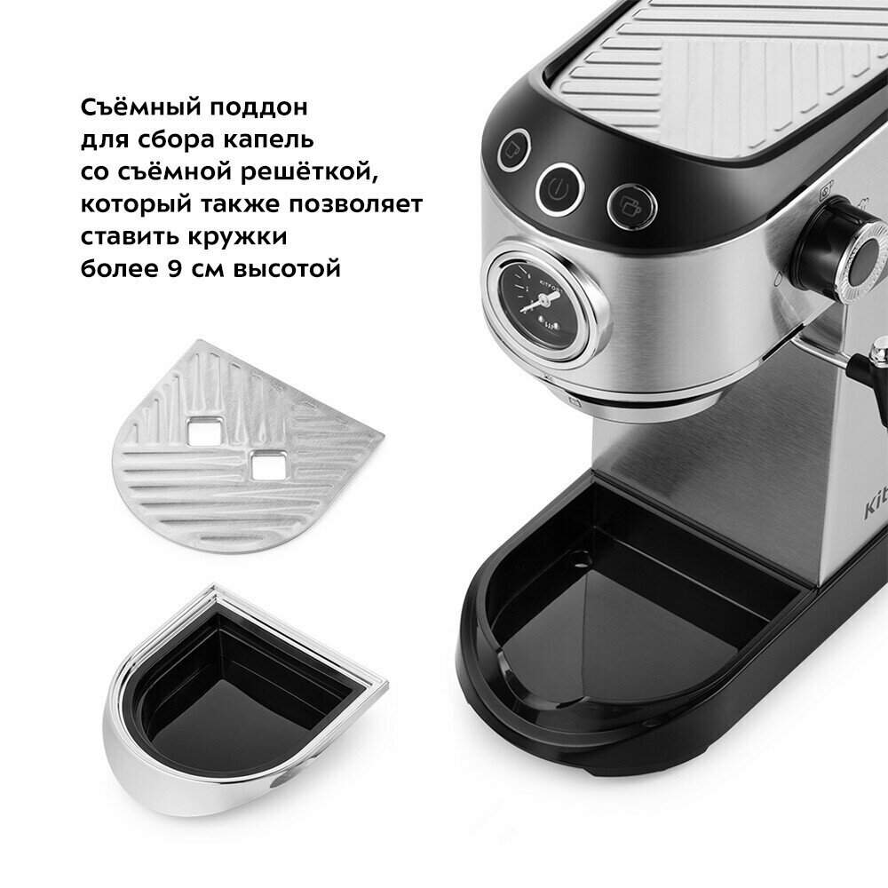 Кофеварка рожковая Kitfort KT-7106 (используемый кофе - молотый, 1450 Вт, 1 л), серебристый интересное: