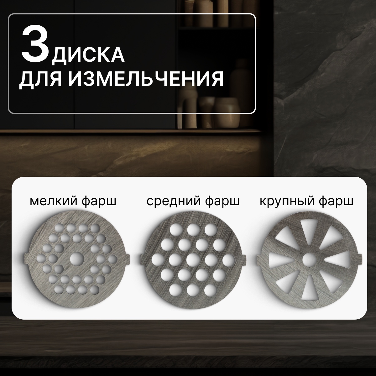 | Насадки | диск для фарша / насадка для кеббе / насадка для приготовления колбас / насадка-терка |