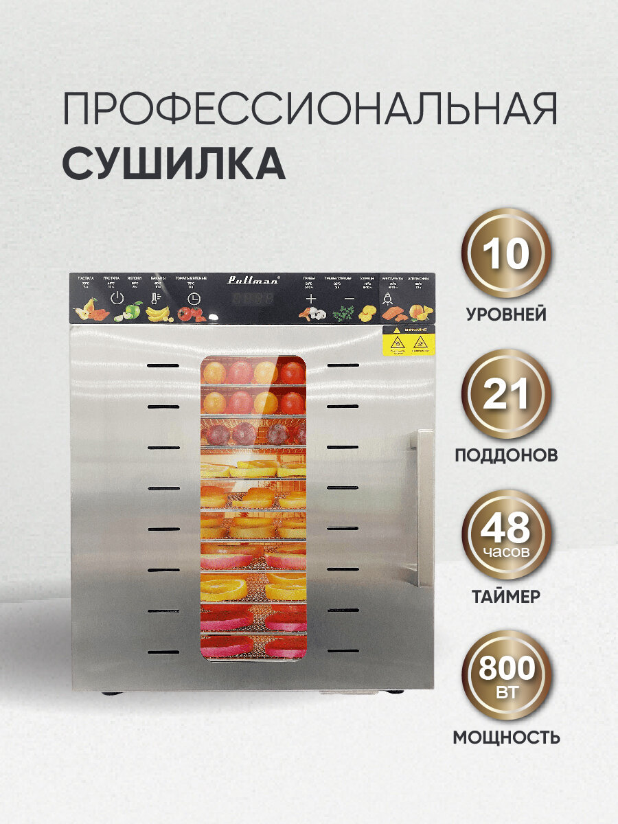 Купить Сушилка для овощей и фруктов Pullman PL-1110, двухслойный корпус дегидратора, 800Вт, 21 поддон, поддоны для пастилы в комплекте