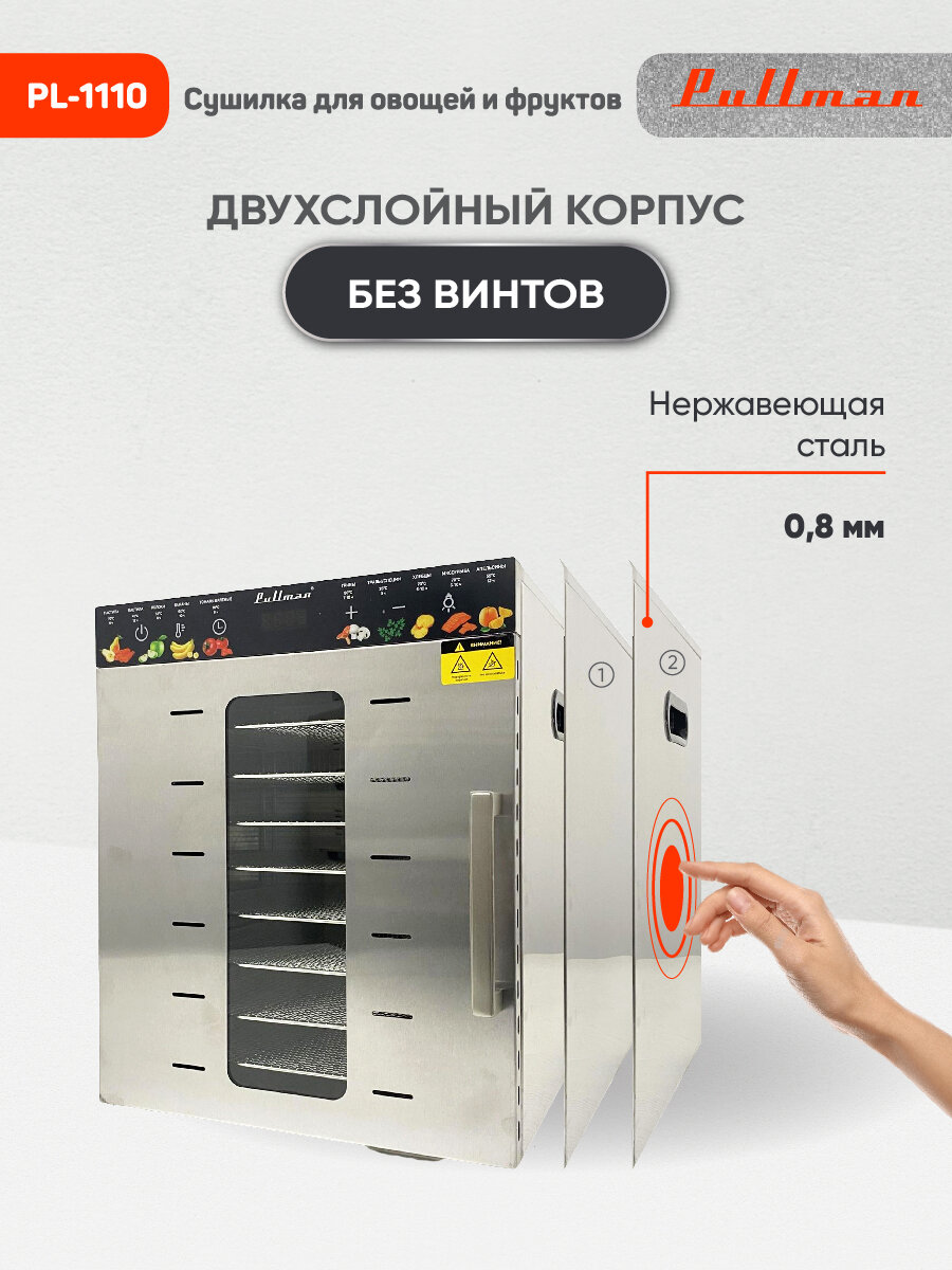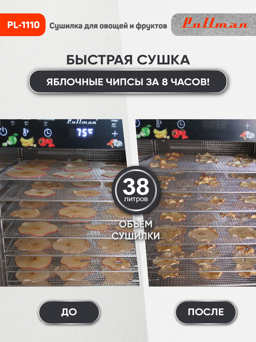 Сушилка для овощей и фруктов Pullman PL-1110, двухслойный корпус дегидратора, 800Вт, 21 поддон, поддоны для пастилы в комплекте интересное: