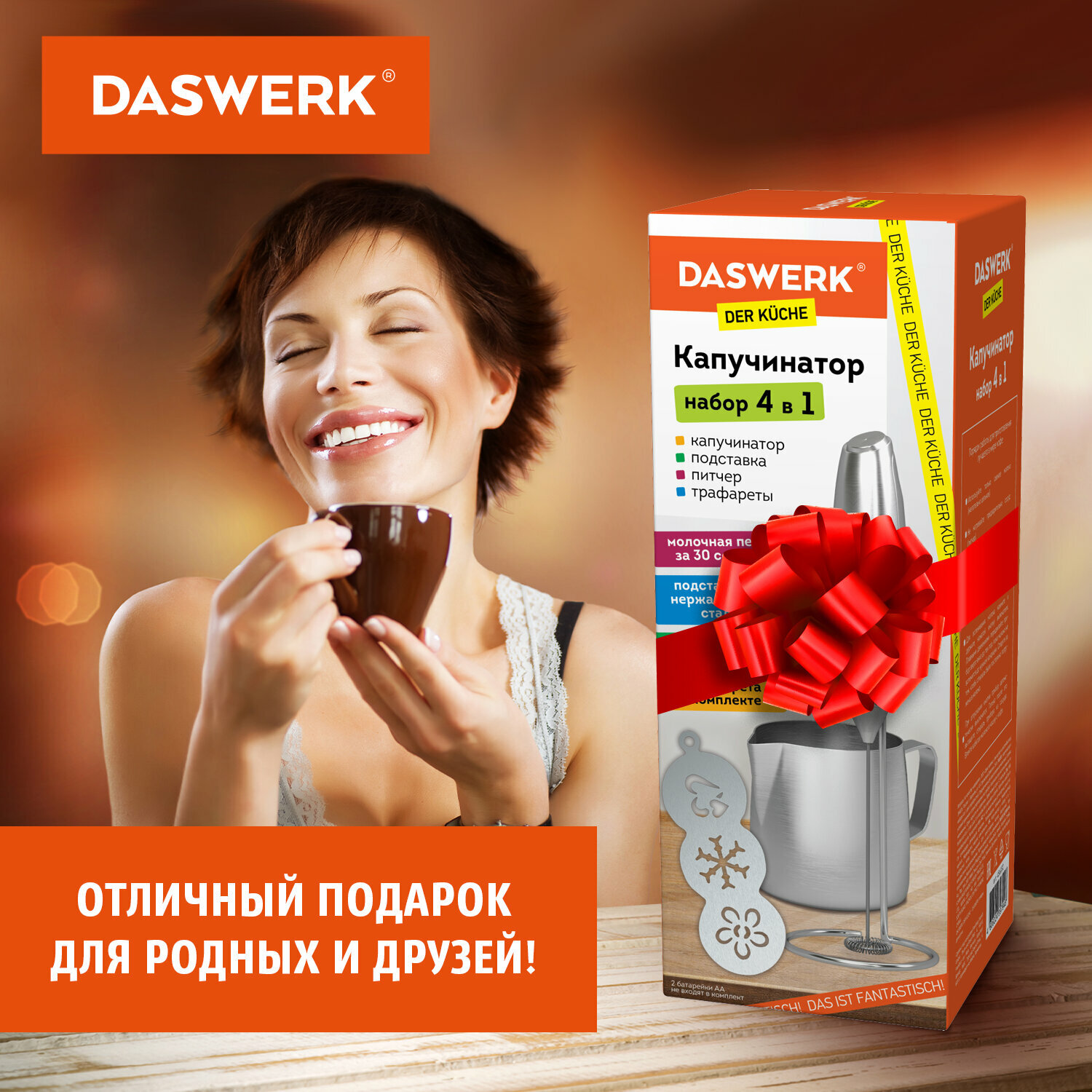 Капучинатор электрический, вспениватель молока для дома и кухни с подставкой, питчером, трафаретами 4 в 1, серебряный, Daswerk, 456182