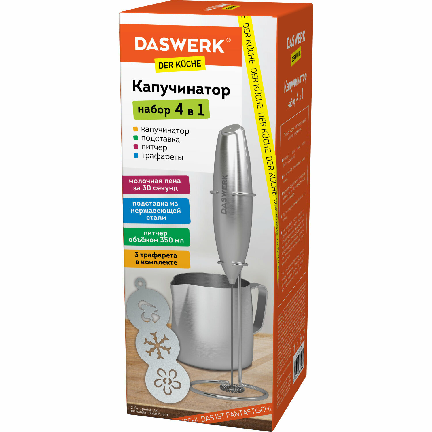 Купить Капучинатор/вспениватель электрический с подставкой, питчером, трафаретами 4 в 1, серебряный, DASWERK, 456182