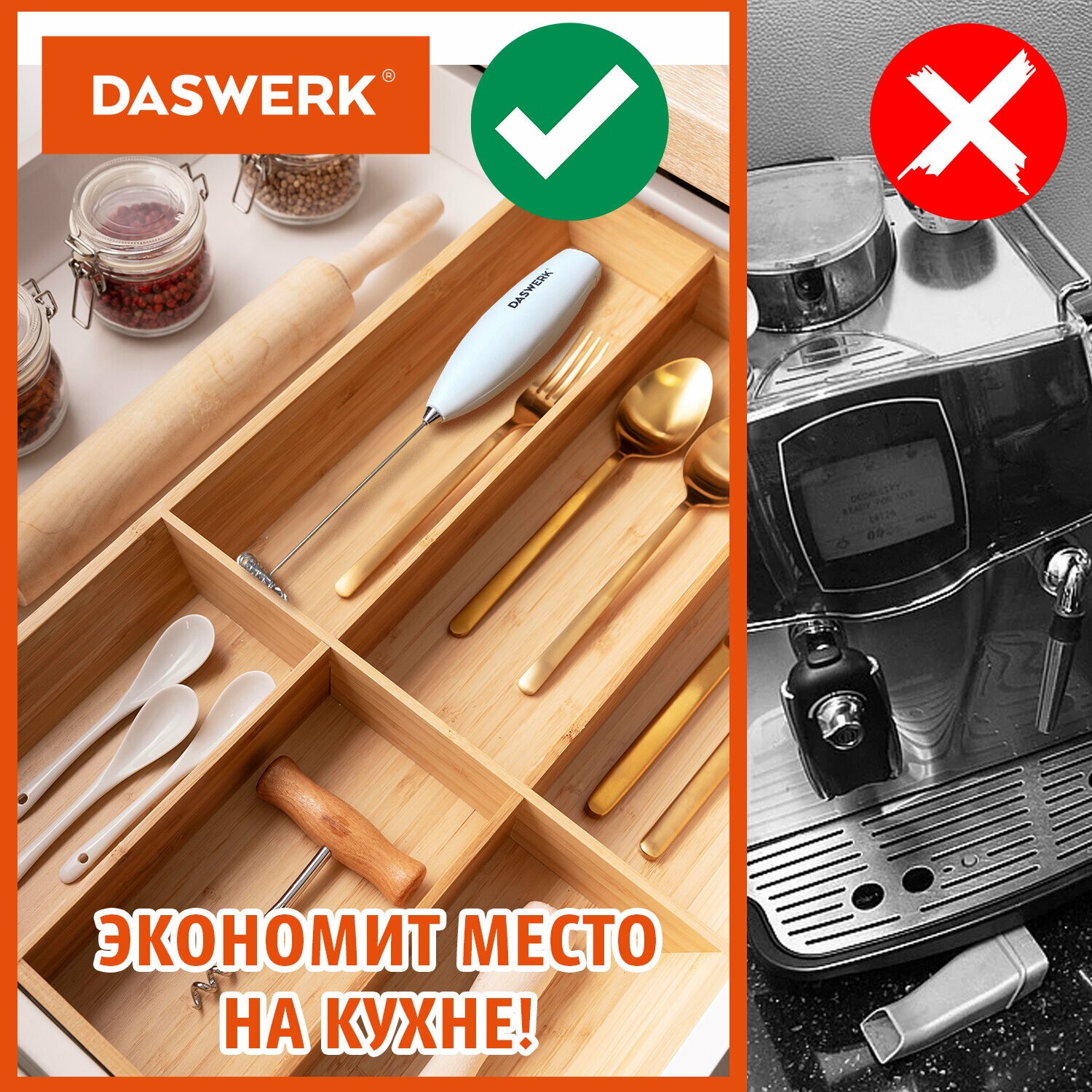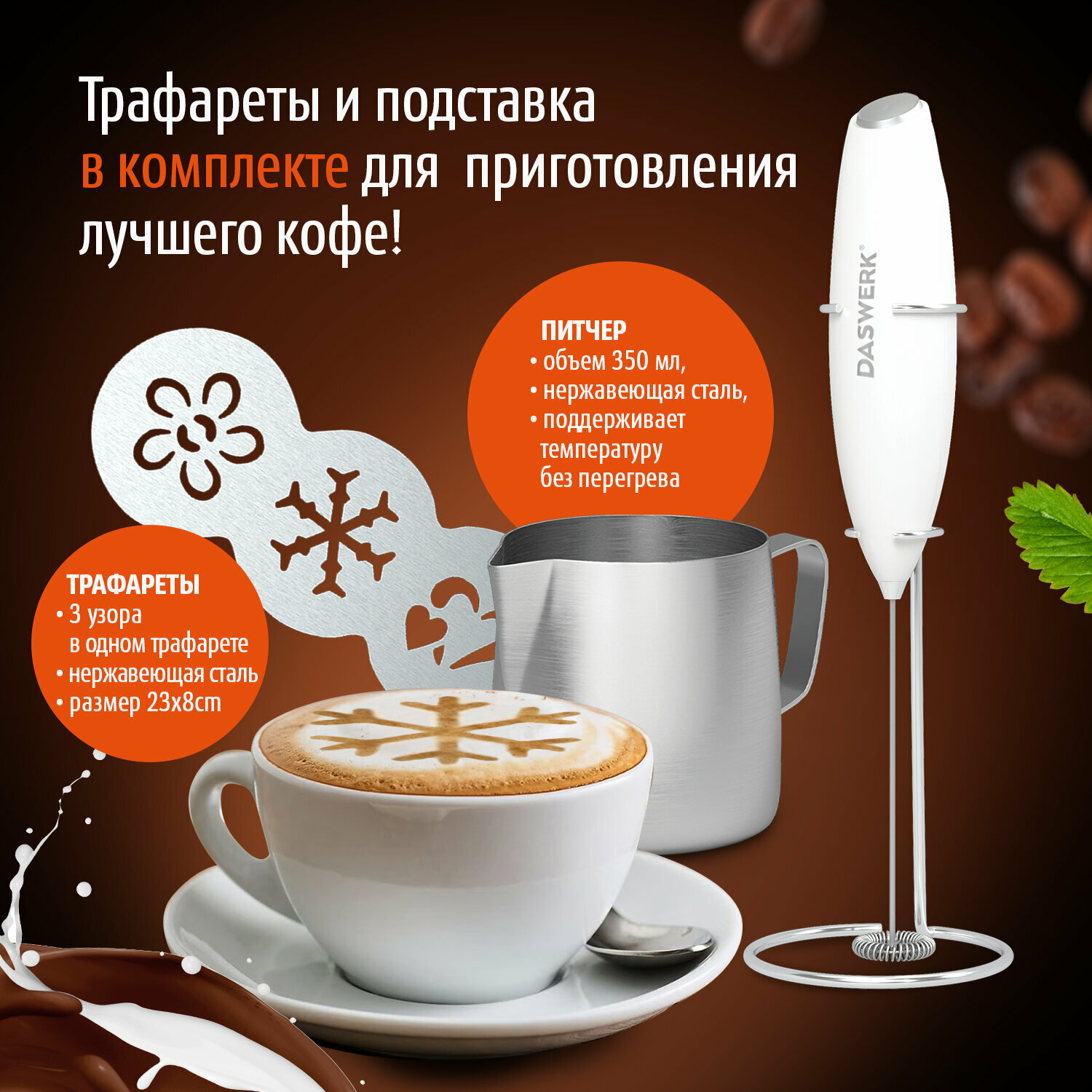 Капучинатор электрический, вспениватель молока для дома и кухни с подставкой, питчером, трафаретами 4 в 1, белый, Daswerk, 456180