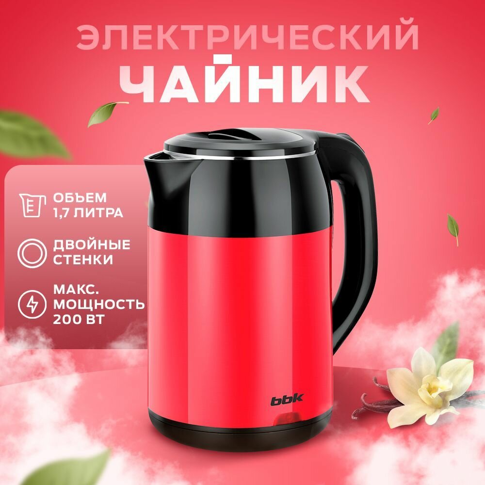 Купить Чайник электрический BBK EK1709P черный/красный, объем 1,7 л, мощность 1800-2000 Вт, двойные стенки