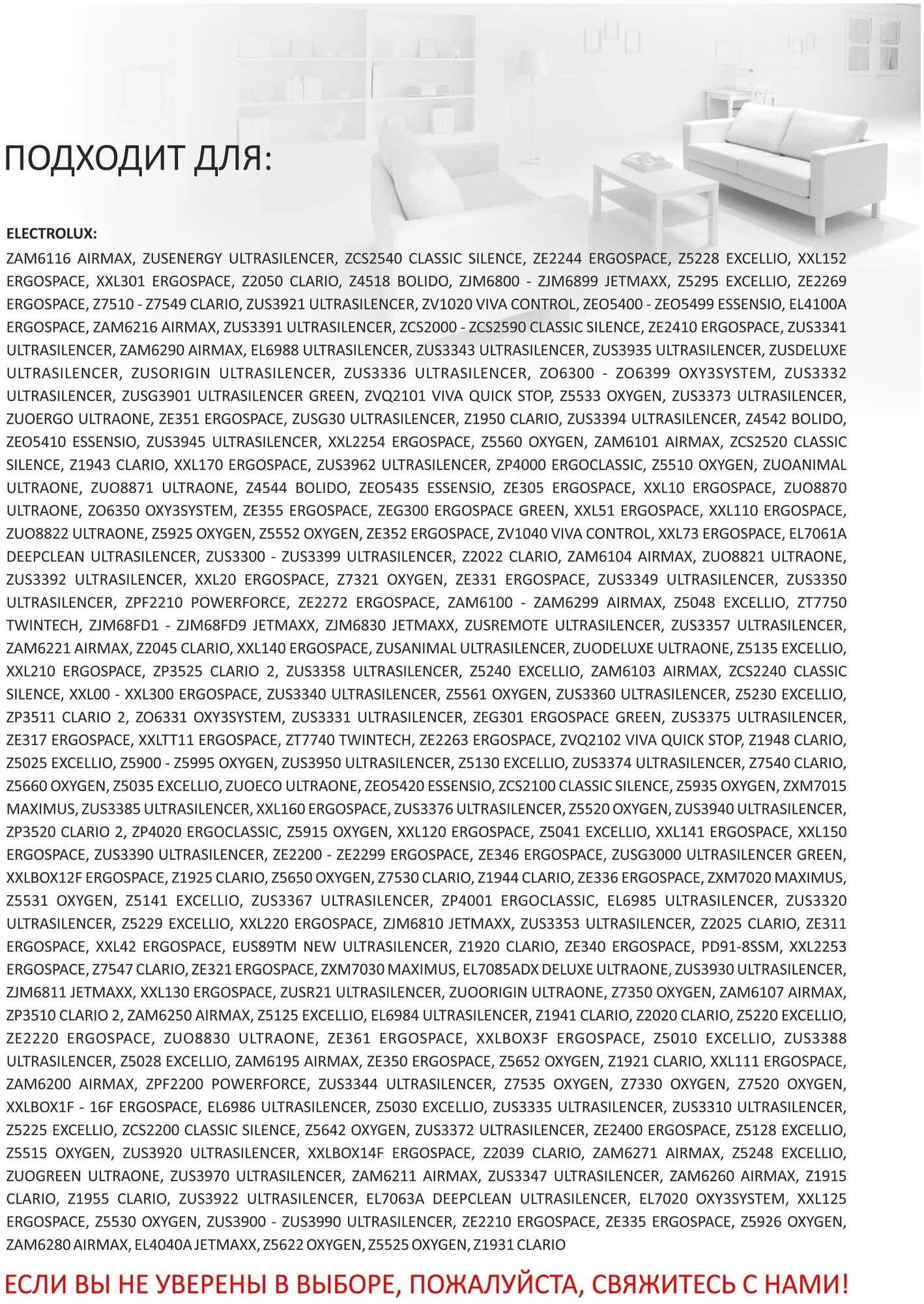 | Совместимые модели | Electrolux Viva Control; Sm Vac; Clario; Oxygen; Viva QuickStop; AirMax; ErgoSpace; Oxy 3 system; Ultra Silencer; Bolido; Oxygen+; Excelio; Clario; Philips Expression; Expression; Expression; Impact Plus; Universe; Impact; Jevel; City Line; Specialist; City Line; Performer |