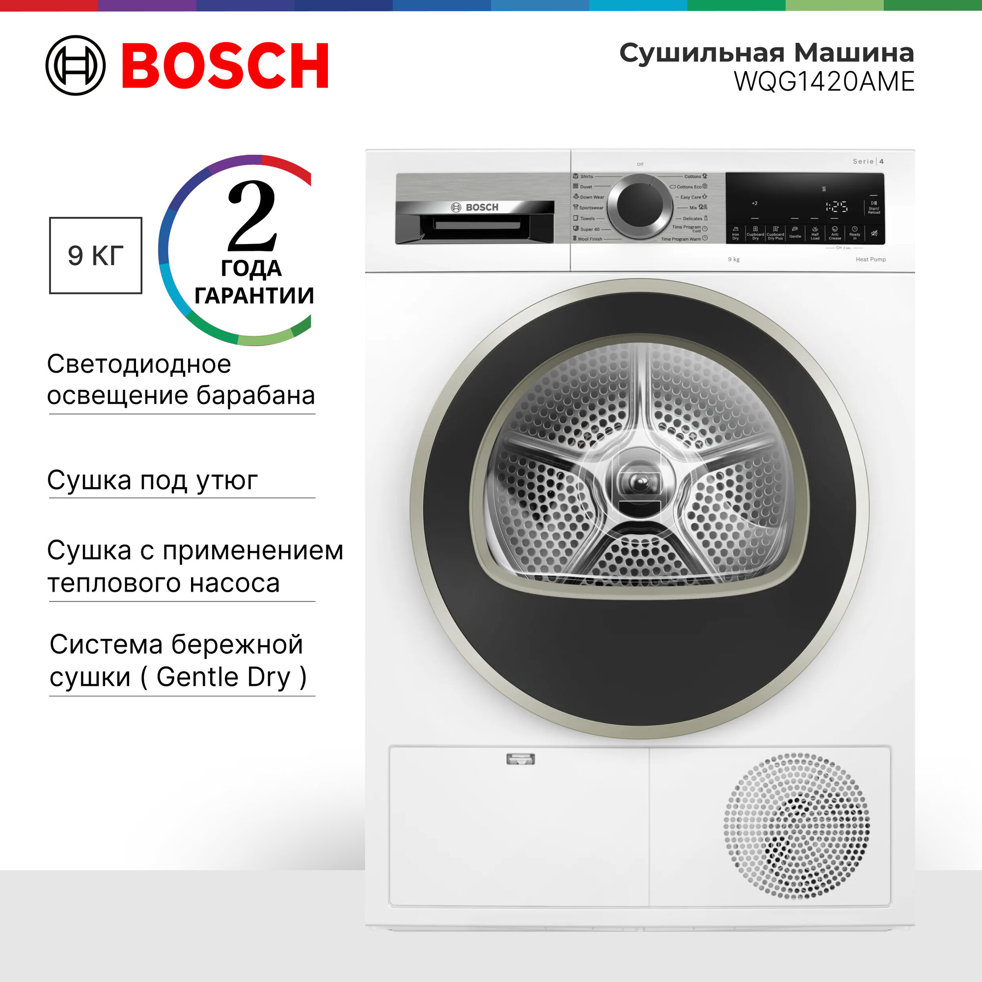 Сушильная машина Bosch WQG1420AME Serie 4, c тепловым насосом, загрузка - 9кг, Класс - A++, LED-дисплей интересное: