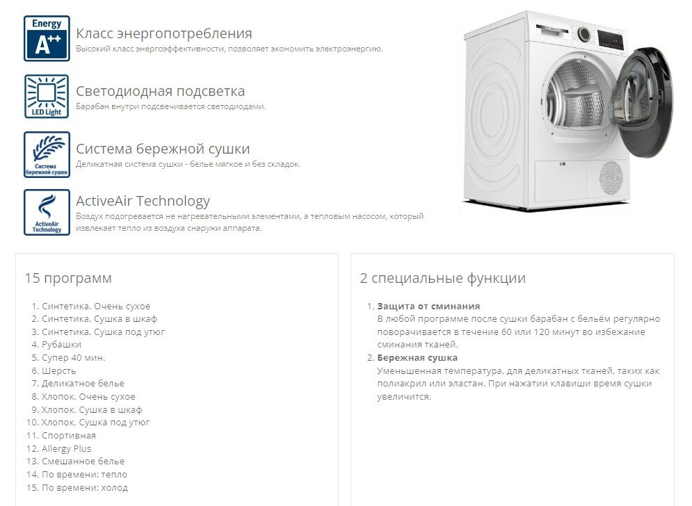| Режимы / функции | бережная сушка / полотенца / пуховые изделия / синтетика / смесовые ткани / сорочки (рубашки) / спортивное бельё / хлопок |