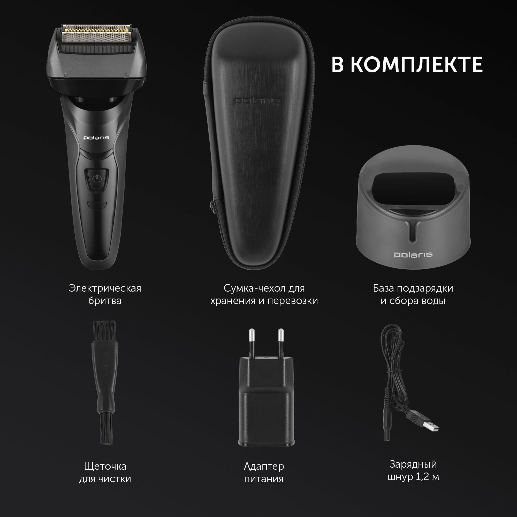 Бритва для мужчин электрическая Polaris PMF 1014RC wet&dry 5D PROF 3+, сетчатая, для сухого и влажного бритья, быстрая зарядка, дисплей, зарядная база, черный/графит