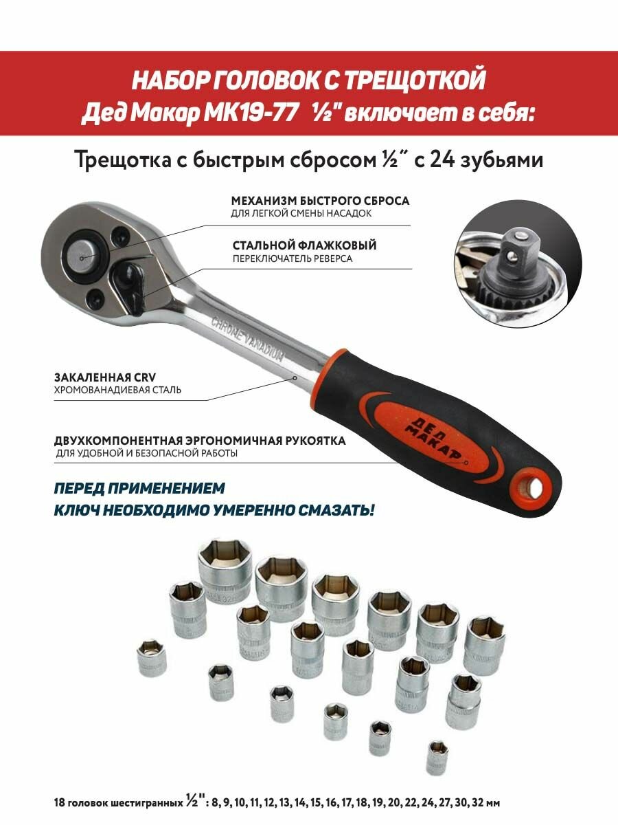Купить Дед Макар Набор головок шестигранных МК19-77 с трещоткой 1/2, 19 предметов 00-00015837