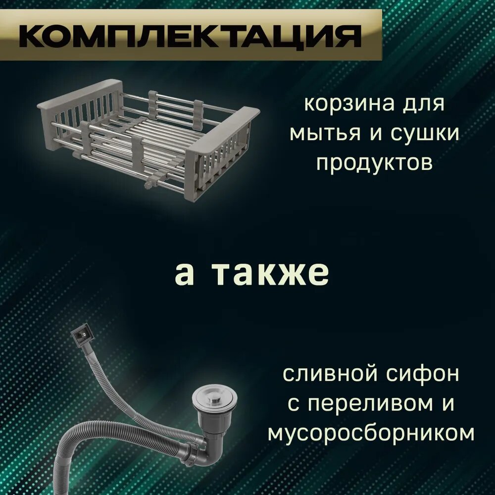 Мойка SIRIUSLINE Premium 60х50 из нержавеющей стали Графит SL6050G (в комплекте с коландером, врезным дозатором, и сифоном) толщина стали 3 мм