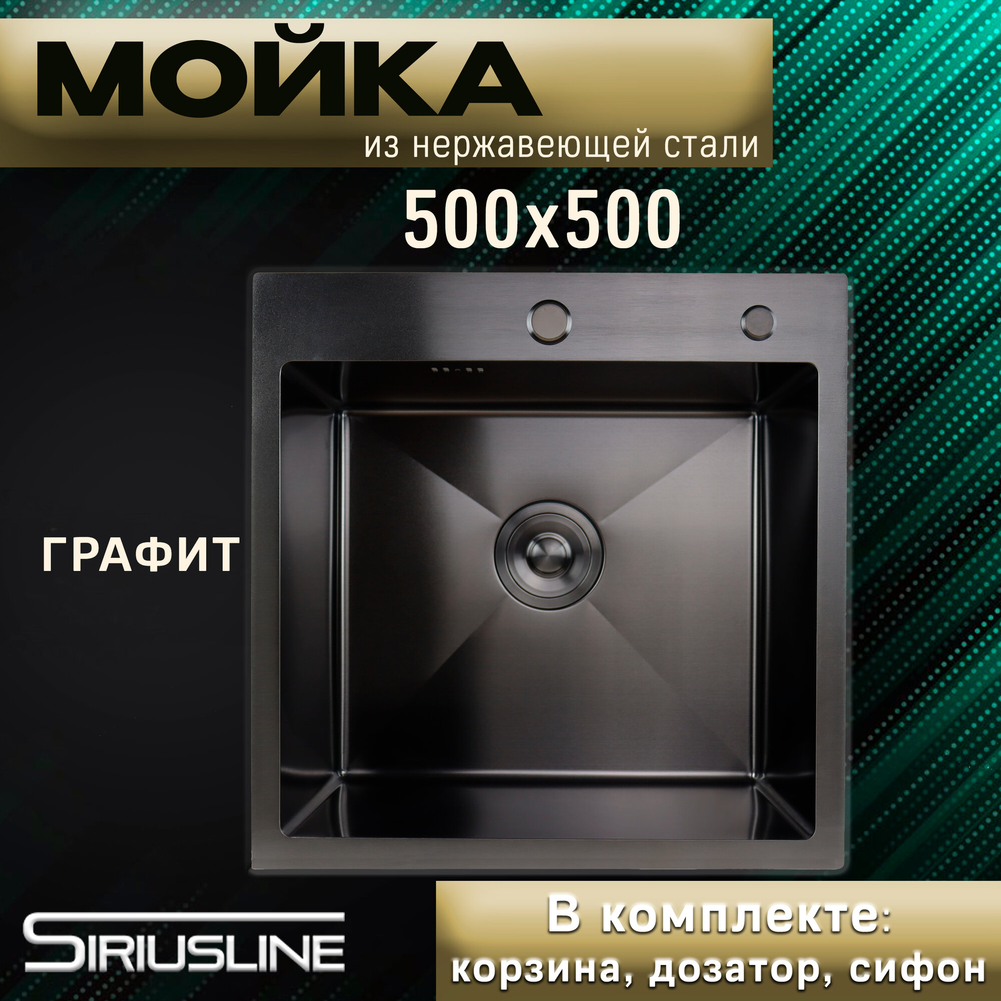 Мойка SIRIUSLINE Premium 50х50 из нержавеющей стали Графит SL5050G (в комплекте с коландером, врезным дозатором, и сифоном) толщина стали 3 мм